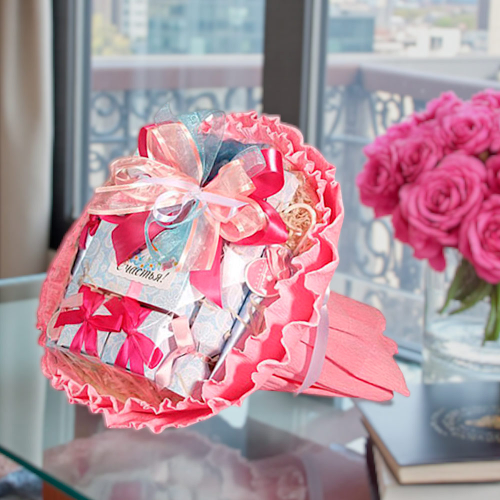 Если в вашем близком окружении есть человек, чью улыбку вы редко видите, то преподнесите ему идеальный шоколадный подарок - розовый букет с пожеланием счастья!