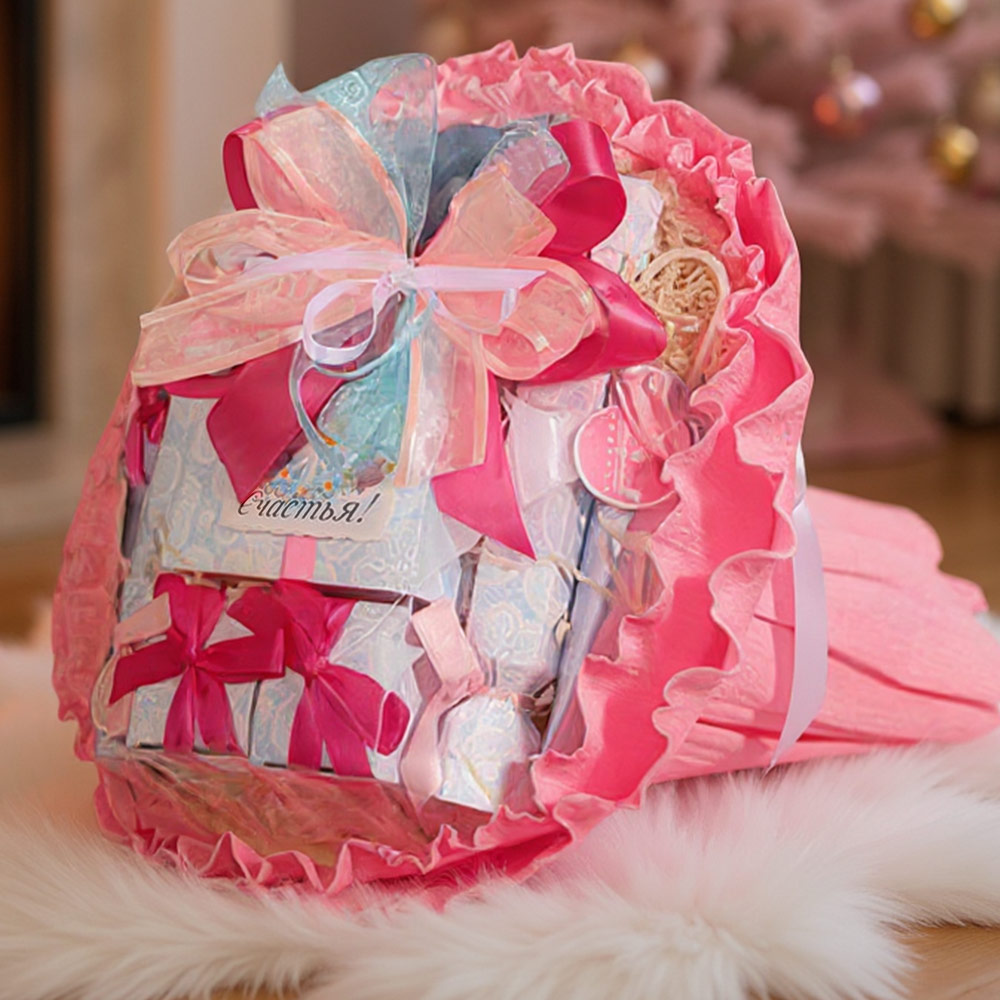 Этот дивный розовый букет - не просто сувенир, а набор изысканных десертов, которые поднимут настроение любому, кому вы их подарите! Ведь букет состоит из самых вкусных лакомств - конфет-суфле и конфет с курагой, финиками, черносливом, глазированных шоколадом.