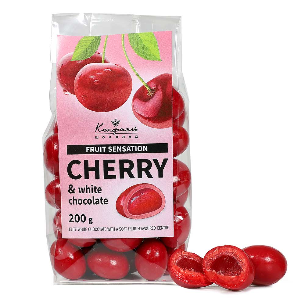 какао масло, молоко сухое цельное, молоко сухое обезжиренное, лактоза, эмульгатор (лецитин соевый), ароматизатор («Ванилин»); декор – пищевой краситель (концентрированный сок красной редиски, масло подсолнечное, эмульгаторы (мальтодекстрин, Е472с), регуляторы кислотности (лимонная кислота, аскорбиновая кислота)), глазирователь (капол); начинка – сахар, патока, желирующий агент (агар, желатин), регулятор кислотности (лимонная кислота), ароматизатор («Вишня»)