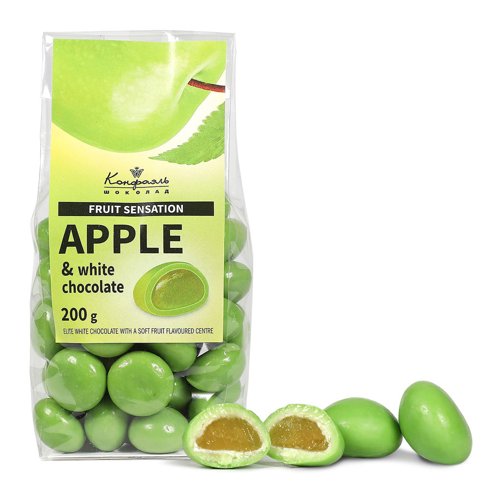 какао масло, молоко сухое цельное, молоко сухое обезжиренное, лактоза, эмульгатор (лецитин соевый), ароматизатор («Ванилин»); декор – пищевой краситель (концентрированный сок красной редиски, масло подсолнечное, эмульгаторы (мальтодекстрин, Е472с), регуляторы кислотности (лимонная кислота, аскорбиновая кислота)), глазирователь (капол); начинка – сахар, патока, желирующий агент (агар, желатин), регулятор кислотности (лимонная кислота), ароматизатор («Яблоко»)