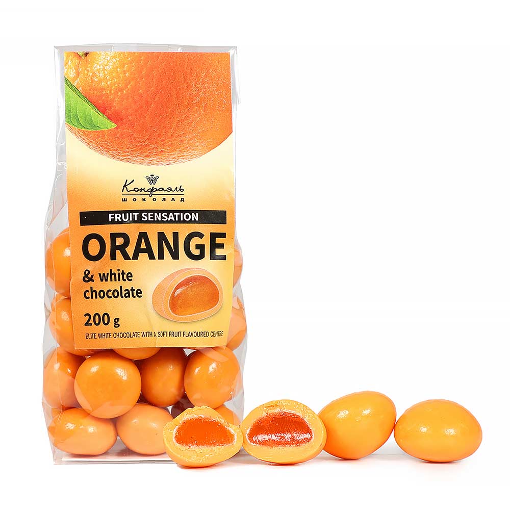 шоколадная масса – какао-масло, сахар, молоко сухое цельное, молоко сухое обезжиренное, лактоза, эмульгатор (лецитин соевый), ароматизаторы («Ванилин», «Апельсин»); начинки – сахар, патока, натуральный концентрированный Апельсиновый сок, желирующие агенты (агар, желатин говяжий), регулятор кислотности (Апельсиновая кислота), ароматизаторы, натуральный пищевой краситель «Турмерик», глазирователь (капол).
