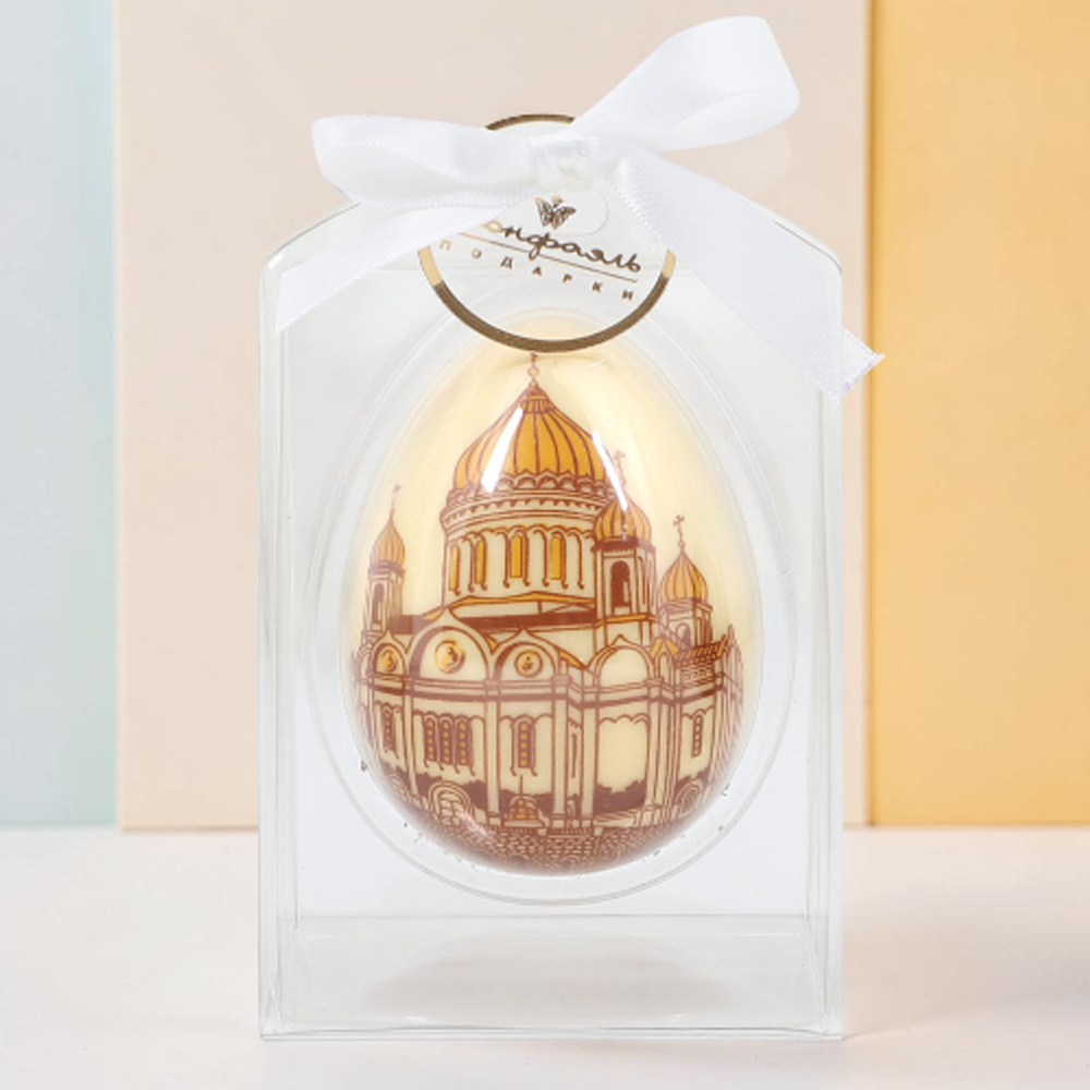 Праздничная упаковка с яйцом из натурального шоколада с изображением храма Христа Спасителя, - идеальный подарок и вкусный десерт для ваших близких и на Пасху, и в качестве сувенира!