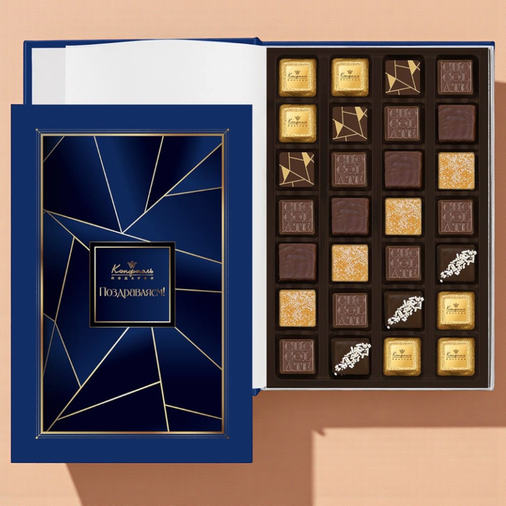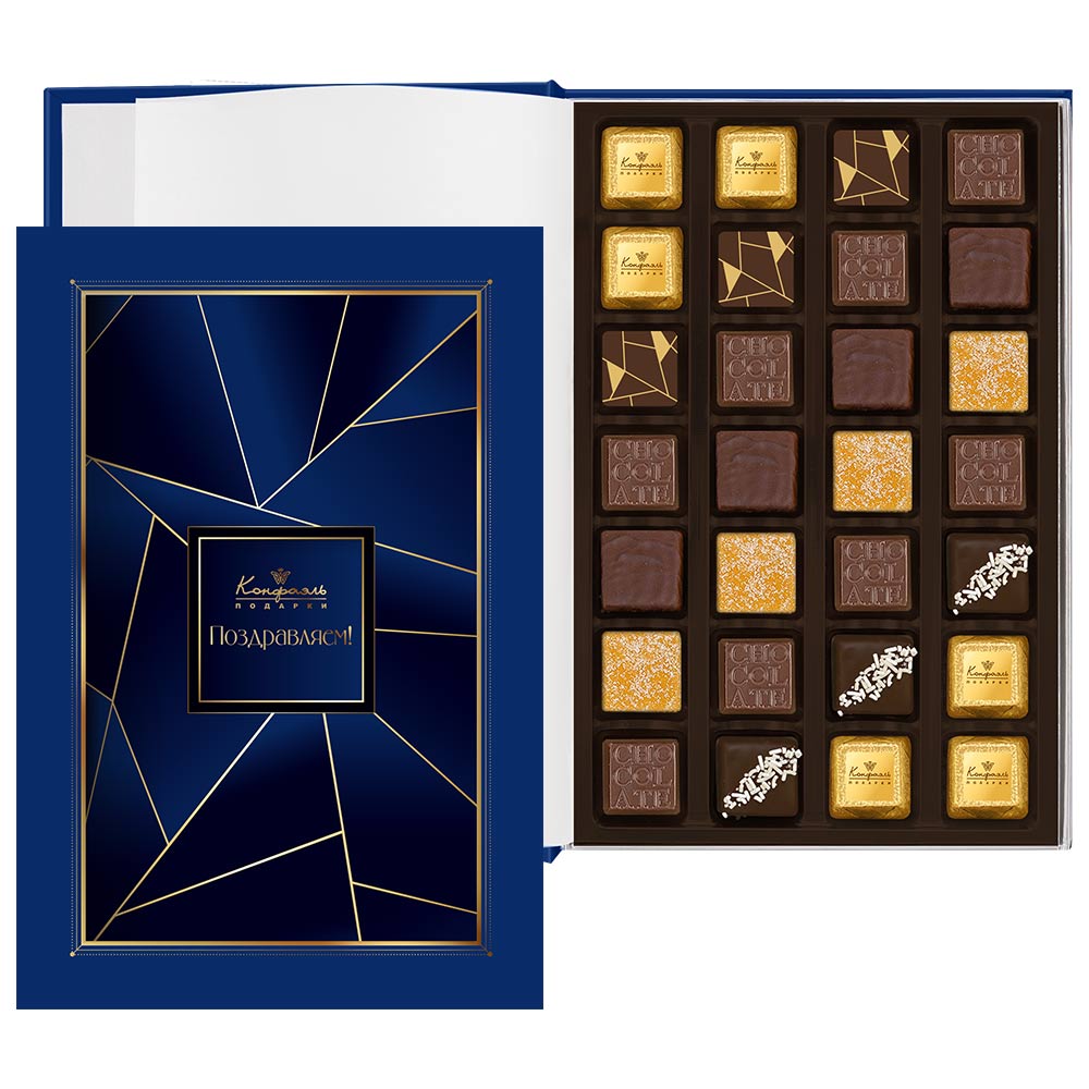 Состав: шоколад - сахар, какао тёртое, масло какао, сыворотка молочная сухая, сухое цельное молоко, эмульгатор (лецитин соевый), ароматизаторы; начинки - сахар, патока, какао-масло, какао тертое, молоко сгущенное (молоко цельное, сахар (сахароза, лактоза)), жир специального назначения (масло ши, рапсовое масло, соевое масло, антиокислитель( лимонная кислота)), молоко сухое цельное, молоко сухое обезжиренное, белый шоколад (сахар, молоко сухое цельное, масло какао, эмульгатор (лецитин соевый), ароматизатор, соль), масла растительные рафинированные дезодорированные (подсолнечное, рапсовое, оливковое; масло сладко-сливочное, молоко сухое обезжиренное), масло сладко - сливочное, белок яичный порошкообразный, натуральный концентрированный сок (апельсина), клубника сушеная, кумкват сушеный, вафельная крошка (мука пшеничная х/п первого сорта, сахар, масло кокосовое рафинированное дезодорированное, эмульгатор (лецитин соевый), пшеничные волокна (клетчатка), ароматизатор), цукаты лимонных корочек, папайя сушеная, ананас сушеный, финики, слива свежая, абрикос свежий, ядра орехов фундука, ядра орехов миндаля,стабилизаторы (мальтодекстрин), желирующий агент (агар), желатин говяжий, коньяк (дистиллят коньячный, вода, сахар, пищевой краситель (сахарный колер)), спирт этиловый ректификованный, консервант (сорбиновая кислота), регулятор кислотности (лимонная кислота), эмульгаторы (лецитин соевый, Е471), ароматизаторы, пищевые красители (сахарный колер, куркумин, медные комплексы хлорофиллов и хлорофиллинов); декор - пищевые красители (Е171, куркумин).