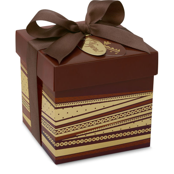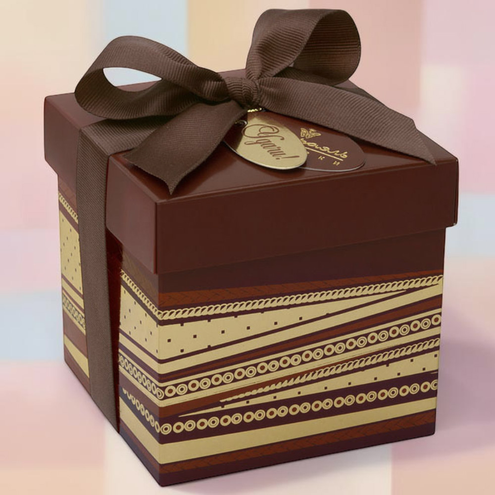 Иногда подарок должен быть минималистичен, особенно если выбирается для серьезного человека. Эта коробочка из украшений имеет только двухцветный геометрический узор, да шоколадного цвета ленту. Однако внутри спряталось нежное и вкусное суфле, способное растопить сердце любого гурмана!