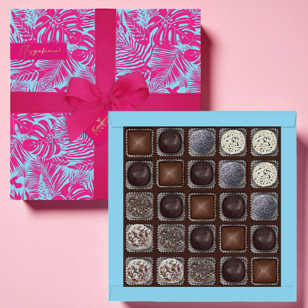 Состав: шоколадные массы – сахар, тертое какао, какао-порошок, масло какао, сыворотка молочная сухая, пахта сухая, эмульгатор (лецитин соевый), натуральная ваниль; начинки – сахар, патока, масло какао, тертое какао, молоко сгущенное (молоко цельное, сахар (сахароза, лактоза)), молоко сухое цельное, молоко сухое обезжиренное, масла растительные рафинированные дезодорированные (подсолнечное, рапсовое, оливковое; масло сливочное, молоко сухое обезжиренное), абрикос сушеный, хурма сушеная, патока, семена чиа, морковь свежая, кокосовая стружка, мак пищевой, соль, стабилизатор (мальтодекстрин), коньяк (дистиллят коньячный, вода, сахар, пищевые красители «Сахарный колер», спирт этиловый ректификованный, загуститель (пектин),консервант (сорбиновая кислота), регулятор кислотности (лимонная кислота), эмульгаторы (лецитин соевый, Е471), ароматизаторы;