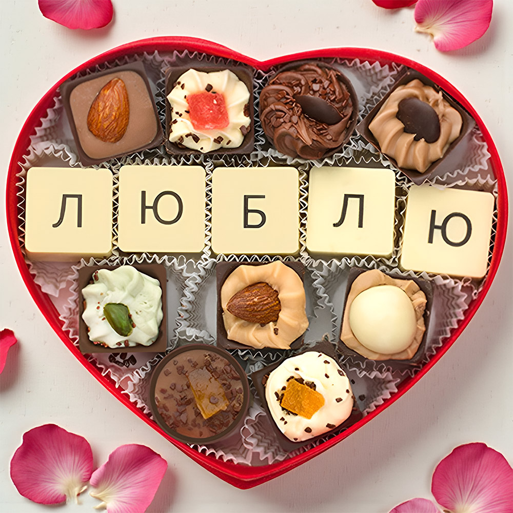 Признаться в любви можно сотней способов, мы же предлагаем самый сладкий из них! Изысканный набор сливочных конфет с высококачественным шоколадом, передаст ваши чувства. Каждая конфетка делается вручную профессиональным шоколатье. Для полноты признания мы положили шоколадки с самым искренним и теплым словом "Люблю".