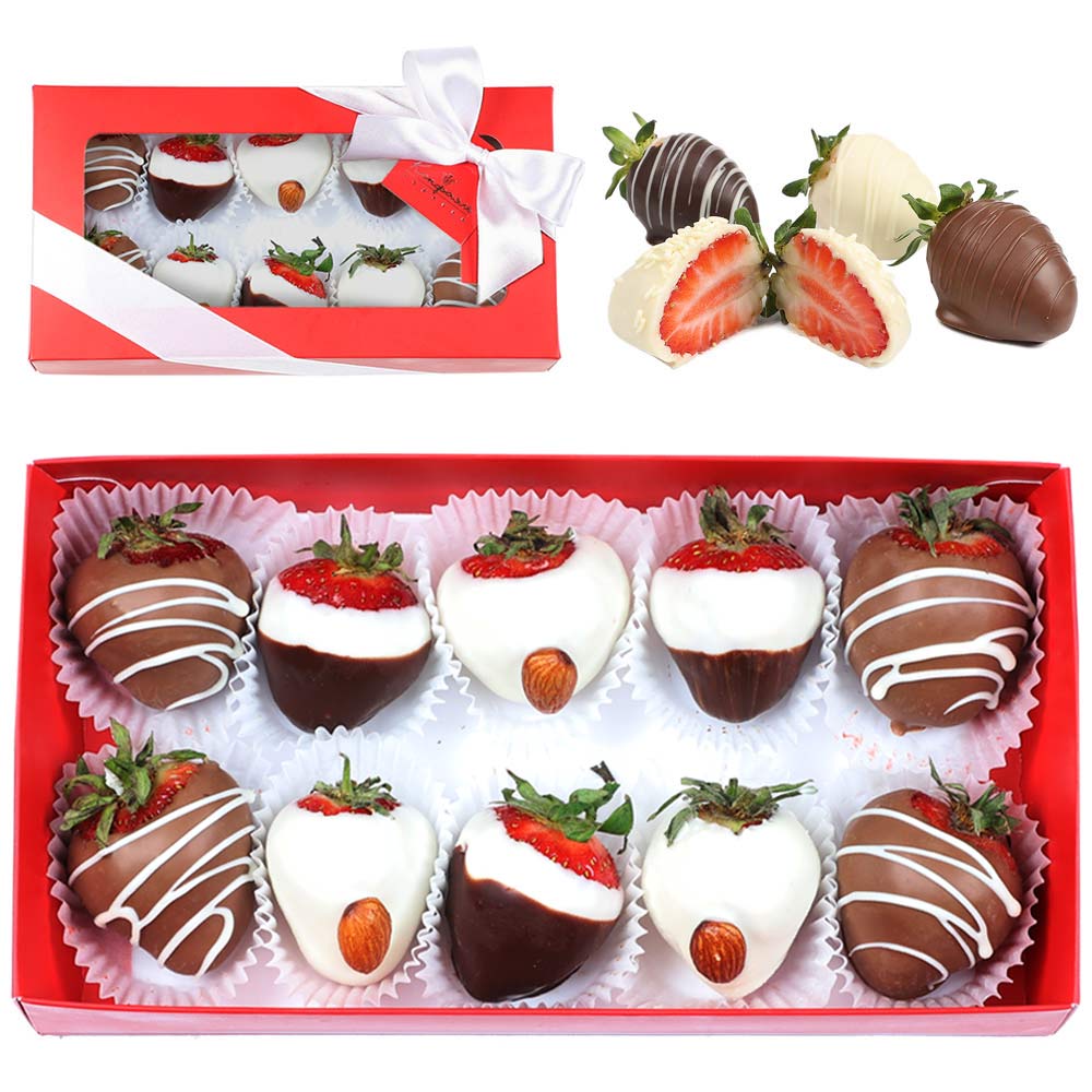 Конфеты глазированные "Клубника в шоколаде" с декором белым, горьким, молочным шоколадом и миндалем