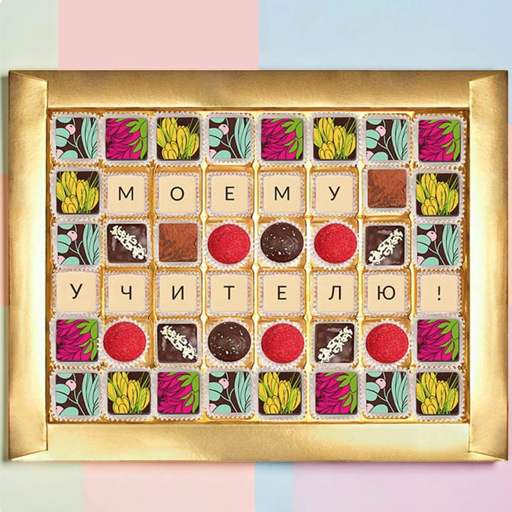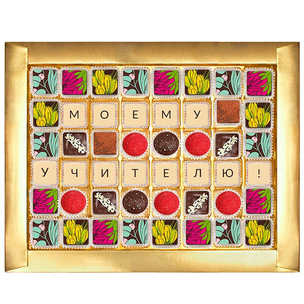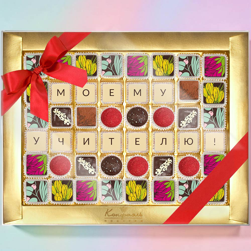 шоколадные массы – какао-масло, какао тертое, сахар, молоко сухое цельное, молоко сухое обезжиренное, лактоза, эмульгатор (лецитин соевый), ароматизатор («Ванилин»); начинки – сахар, патока, глюкозный сироп, какао-масло, какао тертое, молоко сгущенное (молоко цельное, сахар (сахароза, лактоза)), молоко сухое цельное, молоко сухое обезжиренное, лактоза, натуральные концентрированные соки (малиновый, лимонный, черносмородиновый), пюре малины, пюре манго, пюре маракуйи, малина сублимированная, мята сушеная, ядра орехов миндаля, ядра орехов фисташки, марципановая масса, какао порошок, стабилизатор (мальтодекстрин, гуммиарабик), коньяк (дистиллят коньячный, вода, сахар, пищевой краситель «Карамельный колер»), спирт этиловый ректификованный, консервант (сорбиновая кислота), регулятор кислотности (лимонная кислота), эмульгаторы (лецитин соевый, Е471), ароматизаторы, пищевой краситель «Карамельный колер»; декор – пищевые красители (Е132, Е171, Е141, «Куркумин», пищевой краситель (свекольный концентрат)), кандурин зеленый, глазирователь (капол).