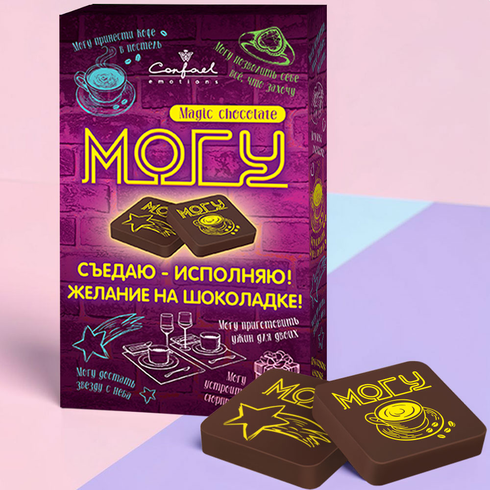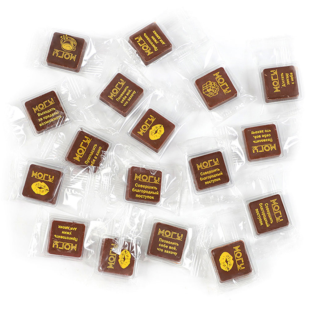 Открыв коробку, Вы увидите молочный шоколад с разными пожеланиями, зарядитесь мотивацией и хорошим настроением!