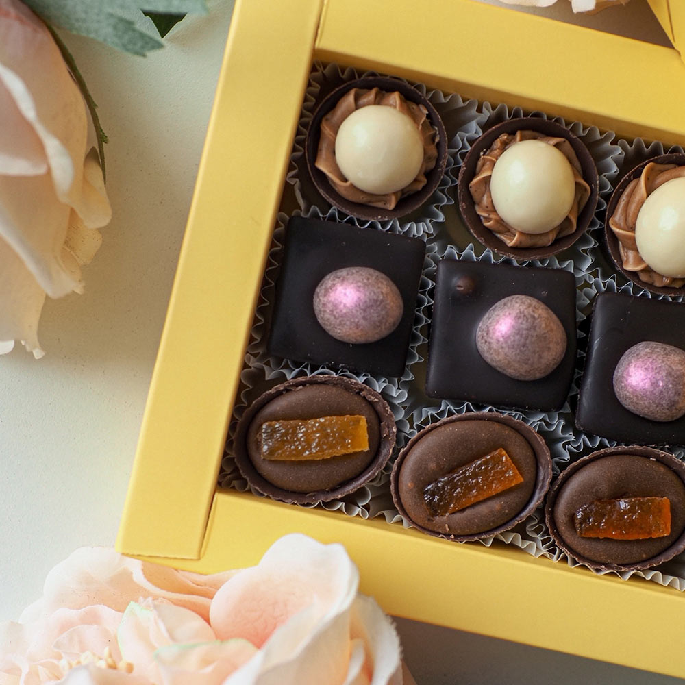 Состав: шоколад - сахар, какао тёртое, масло какао, сыворотка молочная сухая, сухое цельное молоко, эмульгатор (лецитин соевый), ароматизаторы; начинки - сахар, патока, какао-масло, молоко сгущенное (молоко цельное, сахар (сахароза, лактоза)), жир специального назначения (масло ши, рапсовое масло, соевое масло, антиокислитель( лимонная кислота)), молоко сухое цельное, молоко сухое обезжиренное, белый шоколад (сахар, молоко сухое цельное, масло какао, эмульгатор (лецитин соевый), ароматизатор, соль), паста из кофе (кофе, растительный жир), цукаты апельсиновых корочек, ананас сушеный, ядра орехов фундука, марципановая масса, кофе натуральный молотый, стабилизатор (мальтодекстрин) коньяк (дистиллят коньячный, вода, сахар, пищевой краситель (сахарный колер)), спирт этиловый ректификованный, консервант (сорбиновая кислота), регулятор кислотности (лимонная кислота), эмульгаторы (лецитин соевый, Е471), ароматизаторы, пищевой краситель (сахарный колер); декор - пищевой краситель (кандурин красный янтарь), глазирователь (капол).