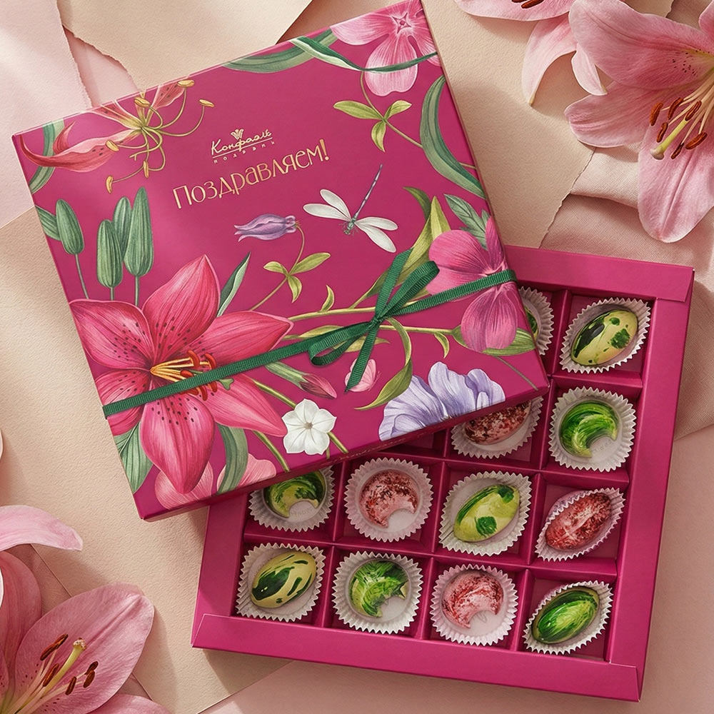 Состав: шоколад - сахар, какао тёртое, масло какао, эмульгатор (лецитин соевый), ароматизатор; начинки - сахар, какао-масло, какао-порошок, какао тертое, молоко сгущенное (молоко цельное, сахар (сахароза, лактоза)), молоко сухое цельное, эмульгатор (лецитин соевый), натуральный концентрированный сок клубники, орех фисташки дробленый, вода, сахар, пищевой краситель (сахарный колер)), консервант (сорбиновая кислота), эмульгаторы (лецитин соевый, Е471), соль, чай Матча, ароматизаторы, пищевые красители (красный свекольный, куркумин, медные комплексы хлорофиллов и хлорофиллинов); декор - пищевые красители (Е171).