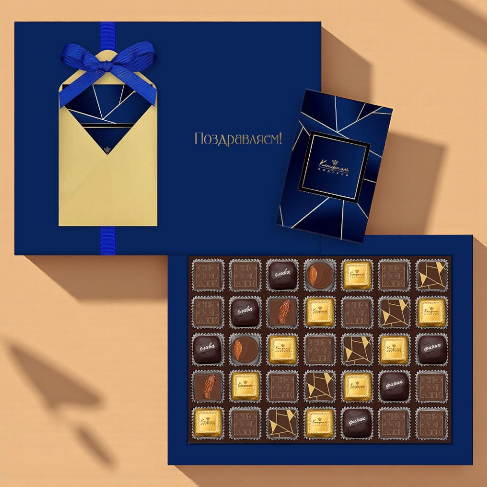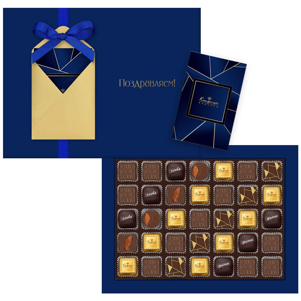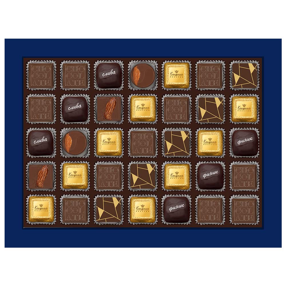 Состав: шоколад - сахар, какао тёртое, масло какао, сыворотка молочная сухая, сухое цельное молоко, эмульгатор (лецитин соевый), ароматизаторы; начинки - сахар, патока, какао-масло, молоко сгущенное (молоко цельное, сахар (сахароза, лактоза)), жир специального назначения (масло ши, рапсовое масло, соевое масло, антиокислитель (лимонная кислота)), молоко сухое цельное, молоко сухое обезжиренное, белый шоколад (сахар, молоко сухое цельное, масло какао, эмульгатор (лецитин соевый), ароматизатор, соль), масла растительные рафинированные дезодорированные (подсолнечное, рапсовое, оливковое; масло сладко-сливочное, молоко сухое обезжиренное), вафельная крошка (мука пшеничная х/п первого сорта, сахар, масло кокосовое рафинированное дезодорированное, эмульгатор (лецитин соевый), пшеничные волокна (клетчатка), ароматизатор), финики, слива свежая, ядра орехов миндаля, стабилизаторы (мальтодекстрин), коньяк (дистиллят коньячный, вода, сахар, пищевой краситель (сахарный колер)), консервант (сорбиновая кислота), эмульгаторы (лецитин соевый, Е471), ароматизаторы, пищевые красители (сахарный колер, медные комплексы хлорофиллов и хлорофиллинов); декор - пищевые красители (Е171, куркумин).