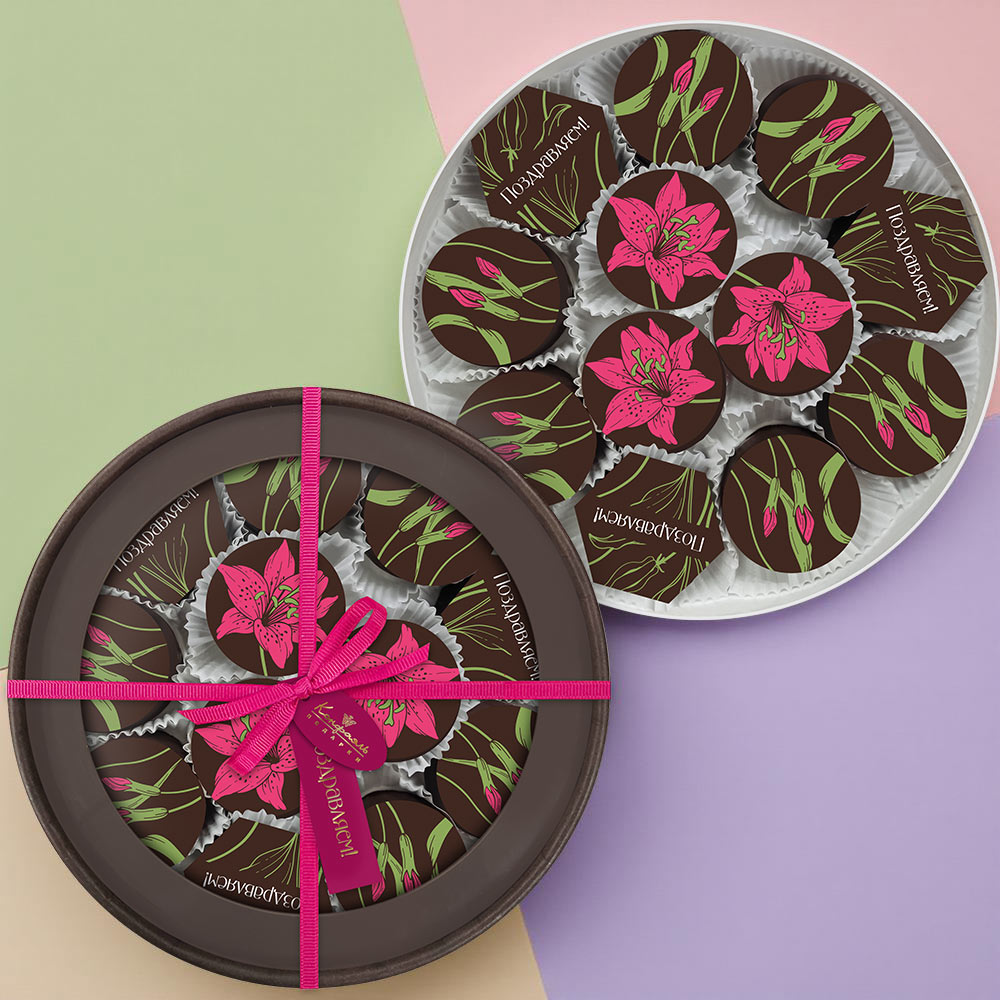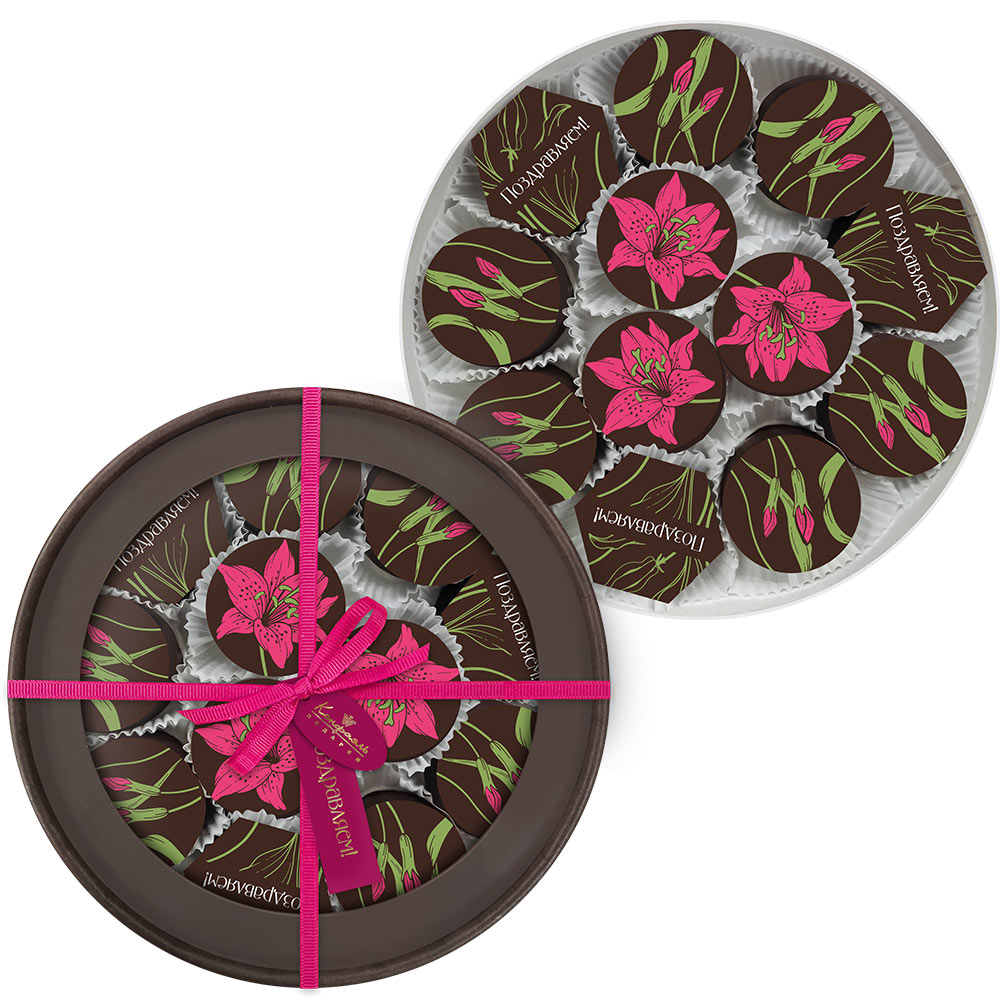 Состав: шоколад – сахар, какао тёртое, масло какао, эмульгатор (лецитин соевый), ароматизатор; начинки – сахар, патока, молоко сгущенное (молоко цельное, сахар (сахароза, лактоза)), масло сладко-сливочное, желирующий агент (агар), яичный белок, какао-порошок, эмульгатор (Е471), ароматизаторы, натуральный экстракт кофе, натуральный пищевой краситель «Сахарный колер»; декор – пищевые красители (красный свекольный, Е171, медные комплексы хлорофиллов и хлорофиллинов). Продукция производится на предприятии, где используются арахис, кунжут, орехи, яичные и молочные продукты, злаки, содержащие глютен.