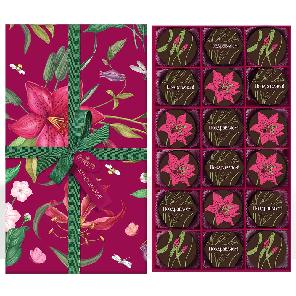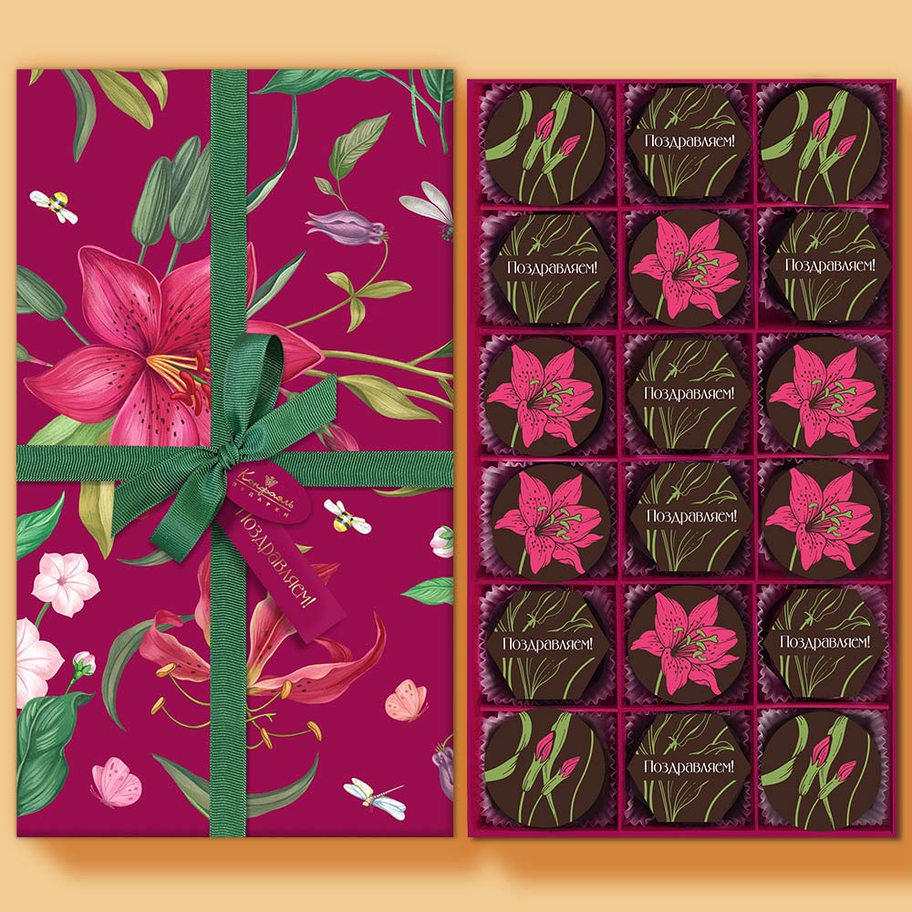 Состав: шоколад - сахар, какао тёртое, масло какао, эмульгатор (лецитин соевый), ароматизатор; начинки – сахар, патока, молоко сгущенное (молоко цельное, сахар (сахароза, лактоза)), масло сладко-сливочное, желирующий агент (агар), яичный белок, какао-порошок, эмульгатор (Е471), ароматизаторы, натуральный экстракт кофе, натуральный пищевой краситель «Сахарный колер»; декор – пищевые красители (красный свекольный, Е171, медные комплексы хлорофиллов и хлорофиллинов). Продукция производится на предприятии, где используются арахис, кунжут, орехи, яичные и молочные продукты, злаки, содержащие глютен.
