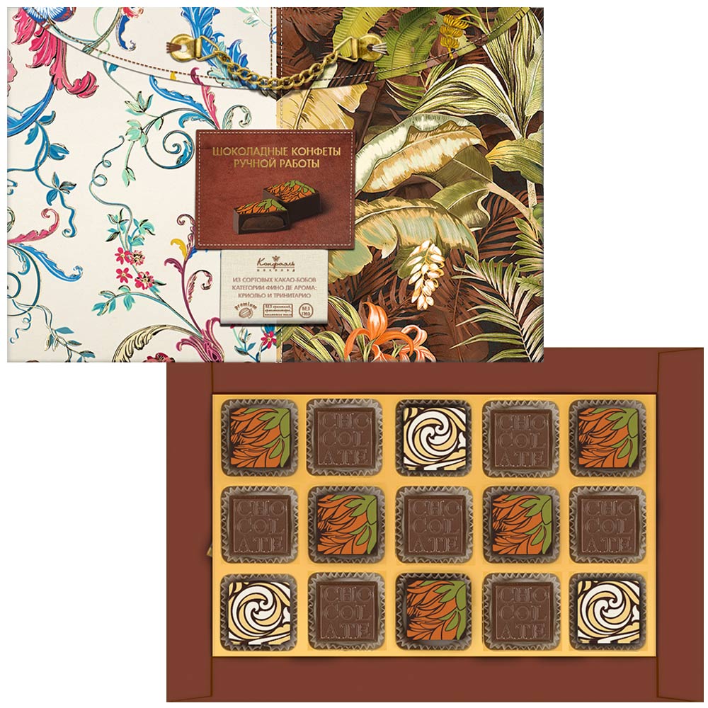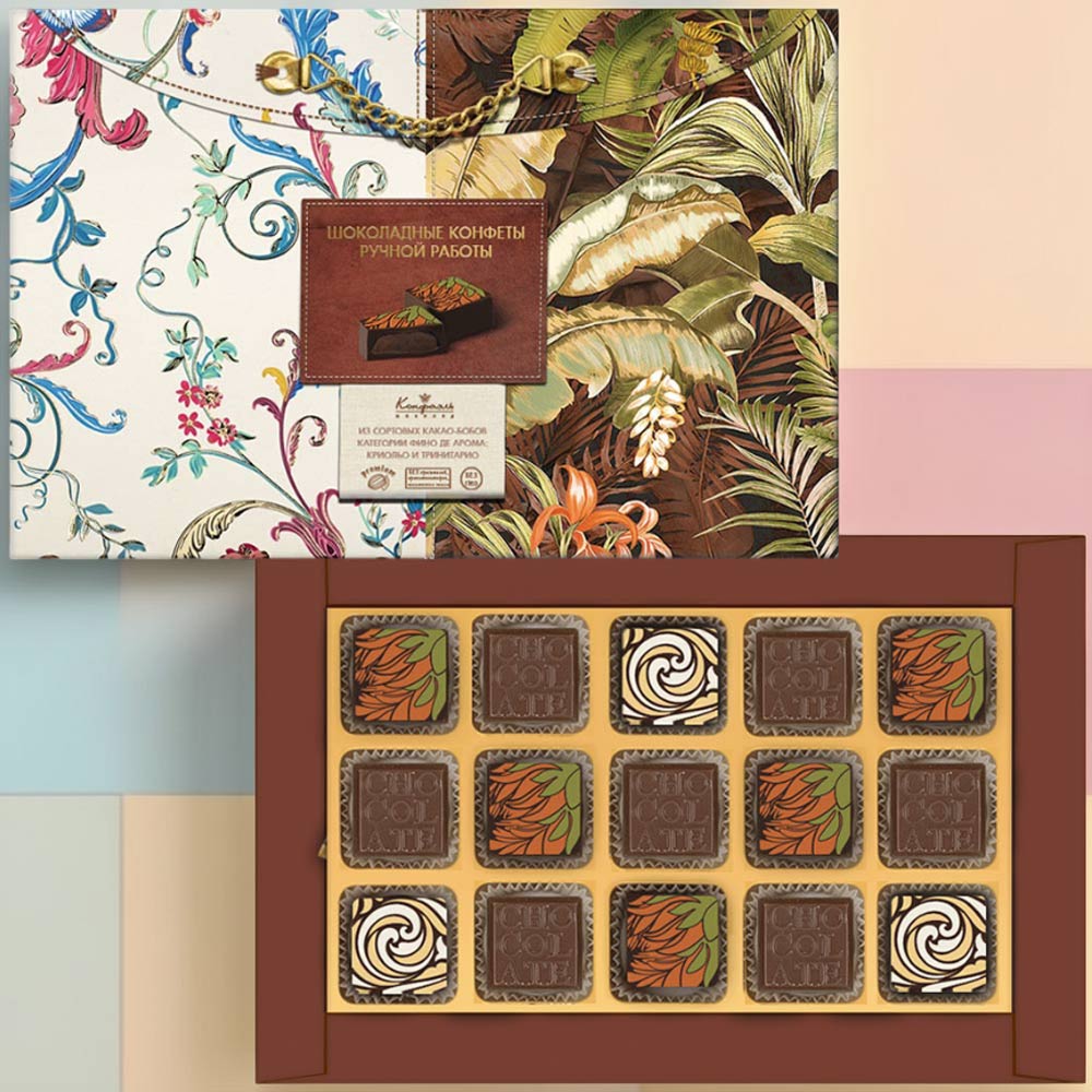 Состав: шоколадные массы - сахар, тертое какао, масло какао, какао-порошок, сыворотка молочная сухая, пахта сухая, эмульгатор (лецитин соевый), натуральная ваниль; начинки - сахар, патока, какао-масло, какао тертое, молоко сгущенное (молоко цельное, сахар (сахароза, лактоза)), молоко сухое, масла растительные рафинированные дезодорированные (подсолнечное, рапсовое, оливковое; масло сливочное, молоко сухое обезжиренное), натуральный концентрированный лимонный сок, натуральный концентрированный апельсиновый сок, стабилизаторы (мальтодекстрин, гуммиарабик), коньяк (дистиллят коньячный, вода, сахар, пищевой краситель «Карамельный колер»), спирт этиловый ректификованный, консервант (сорбиновая кислота), регулятор кислотности (лимонная кислота), эмульгаторы (лецитин соевый, Е471), ароматизаторы; декор - пищевые красители (куркумин, свекольный концентрат, Е132, Е171). Продукция производится на предприятии, где используются арахис, кунжут, орехи, яичные и молочные продукты, злаки, содержащие глютен.