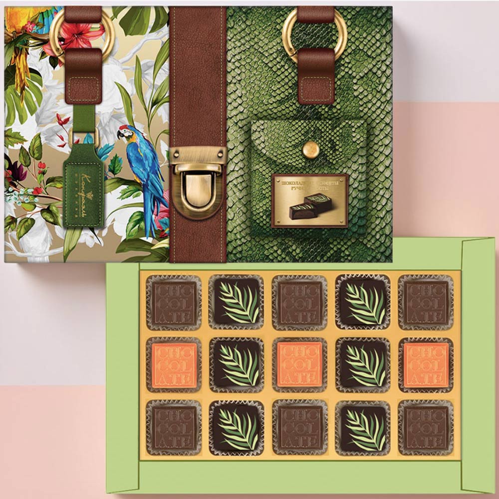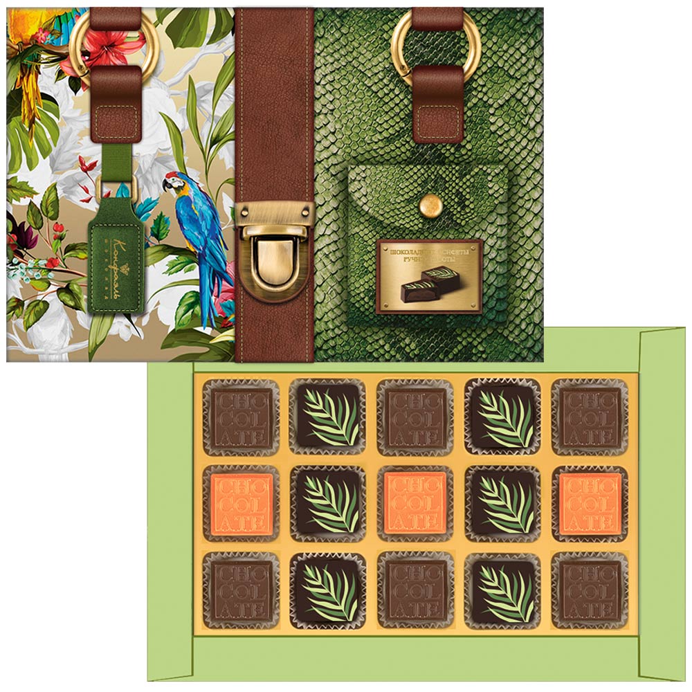 Состав: шоколадные массы - сахар, тертое какао, масло какао, какао-порошок, сыворотка молочная сухая, пахта сухая, эмульгатор (лецитин соевый), натуральная ваниль; начинки - сахар, патока, какао-масло, какао тертое, молоко сгущенное (молоко цельное, сахар (сахароза, лактоза)), молоко сухое, масла растительные рафинированные дезодорированные (подсолнечное, рапсовое, оливковое; масло сливочное, молоко сухое обезжиренное), натуральный концентрированный лимонный сок, стабилизаторы (мальтодекстрин, гуммиарабик), коньяк (дистиллят коньячный, вода, сахар, пищевой краситель «Карамельный колер»), спирт этиловый ректификованный, консервант (сорбиновая кислота), регулятор кислотности (лимонная кислота), эмульгаторы (лецитин соевый, Е471), ароматизаторы; декор - пищевые красители (куркумин, Е132). Продукция производится на предприятии, где используются арахис, кунжут, орехи, яичные и молочные продукты, злаки, содержащие глютен.