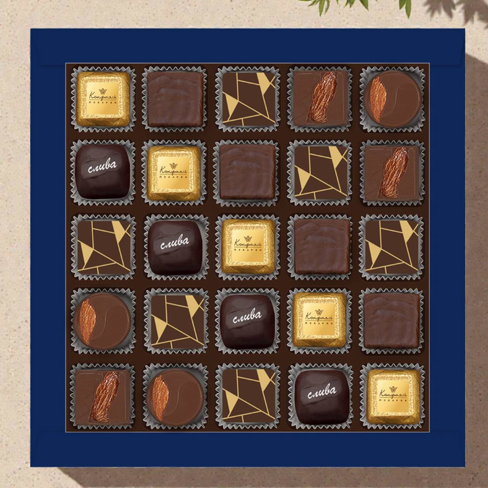 Состав: шоколад - сахар, какао тёртое, масло какао, сыворотка молочная сухая, сухое цельное молоко, эмульгатор (лецитин соевый), ароматизаторы; начинки - сахар, патока, какао-масло, молоко сгущенное (молоко цельное, сахар (сахароза, лактоза)), масла растительные рафинированные дезодорированные (подсолнечное, рапсовое, оливковое; масло сладко-сливочное, молоко сухое обезжиренное), масло сладко - сливочное, белок яичный порошкообразный, жир специального назначения (масло ши, рапсовое масло, соевое масло, антиокислитель( лимонная кислота)), молоко сухое цельное, молоко сухое обезжиренное, белый шоколад (сахар, молоко сухое цельное, масло какао, эмульгатор (лецитин соевый), ароматизатор, соль), слива свежая, ядра орехов миндаля, стабилизаторы (мальтодекстрин), желирующий агент (агар), коньяк (дистиллят коньячный, вода, сахар, пищевой краситель (сахарный колер)), консервант (сорбиновая кислота), регулятор кислотности (лимонная кислота), эмульгаторы (лецитин соевый, Е471), ароматизаторы, пищевые красители (сахарный колер, куркумин); декор - пищевые красители (Е171, куркумин).