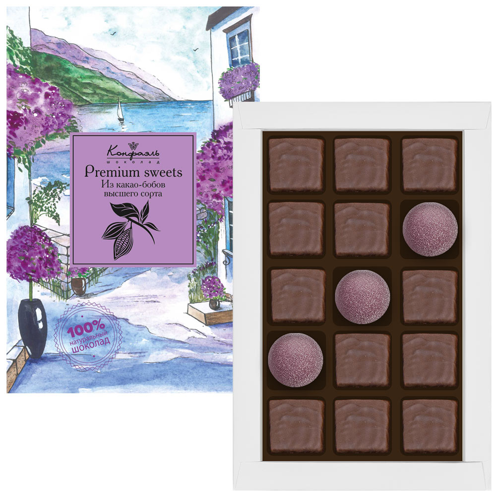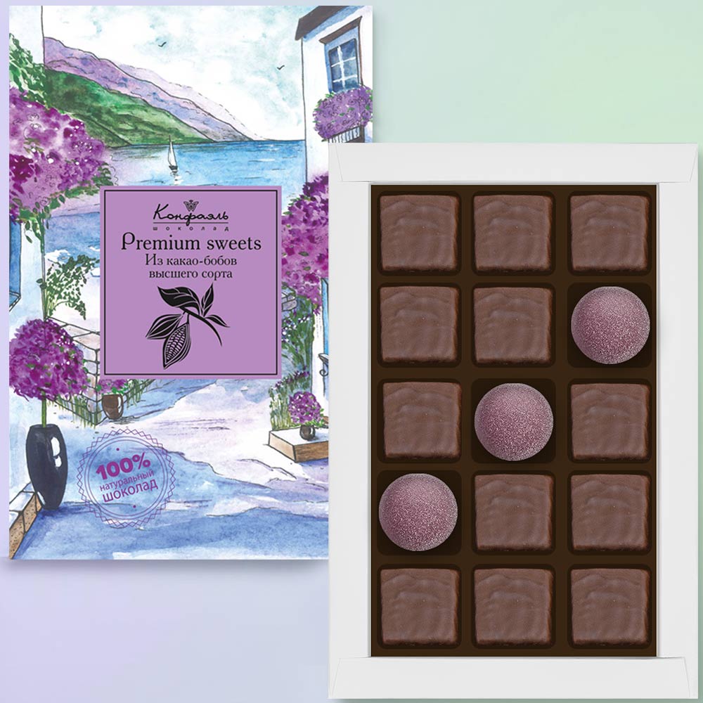 Состав: шоколадная масса -сахар, какао тертое, масло какао, какао-порошок, эмульгаторы (соевый лецитин, Е476); начинки - сахар, патока, молоко сгущенное (молоко цельное, сахар (сахароза, лактоза)), масло сладко-сливочное, белок яичный, йогурт сухой обезжиренный, желирующий агент (агар), желатин говяжий, регулятор кислотности (кислота лимонная), консервант (сорбиновая кислота), эмульгатор (Е471), экстракт ванили, ароматизаторы, пищевые красители (Е132, красный свекольный).