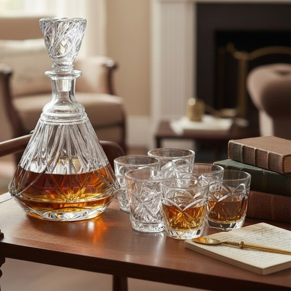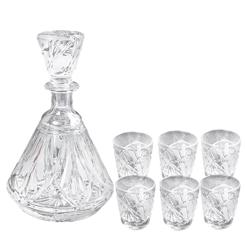Элегантный набор из хрусталя: штоф и 6 стопок — воплощение традиций изысканной сервировки.