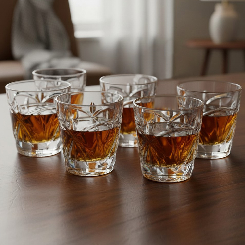 Прочность и долговечность. Толстое дно стопок и надёжная конструкция штофа обеспечивают устойчивость и долгий срок службы.