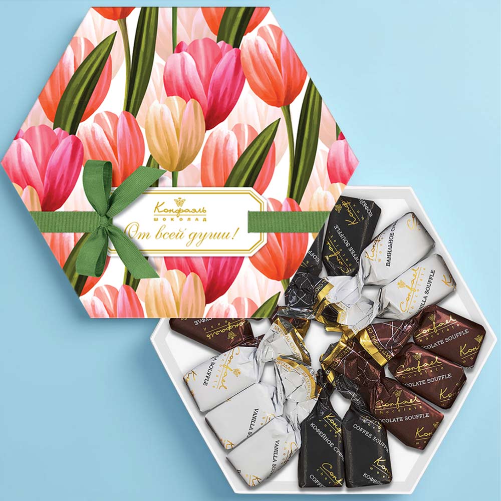 Состав: шоколадная масса – сахар, тертое какао, масло какао, какао-порошок, эмульгатор (лецитин соевый), натуральная ваниль; начинки - сахар, патока, молоко сгущенное (молоко цельное, сахар (сахароза, лактоза)), масло сладко-сливочное, какао-порошок, желирующий агент (агар), яичный белок, регулятор кислотности (лимонная кислота), консервант (сорбиновая кислота), эмульгаторы (Е471), ароматизаторы, натуральный пищевой краситель («сахарный колер»); натуральный экстракт ванили, натуральный экстракт кофе. Продукция производится на предприятии, где используются арахис, кунжут, орехи, яичные и молочные продукты, злаки, содержащие глютен