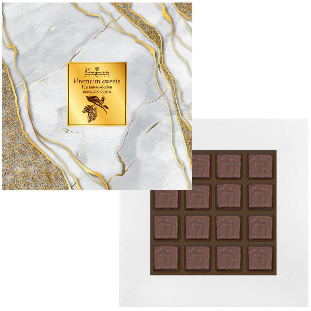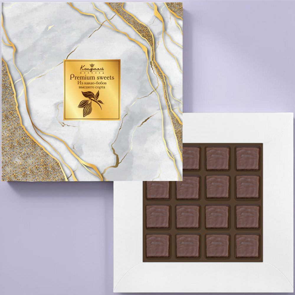Состав: шоколадная масса -сахар, какао тертое, масло какао, какао-порошок, эмульгаторы (соевый лецитин, Е476); начинки - сахар, патока, молоко сгущенное (молоко цельное, сахар (сахароза, лактоза)), масло сладко-сливочное, белок яичный, желирующий агент (агар), регулятор кислотности (кислота лимонная), консервант (сорбиновая кислота), эмульгатор (Е471), какао-порошок, кофе натуральный молотый, экстракт ванили, ароматизаторы, пищевой краситель (сахарный колер).