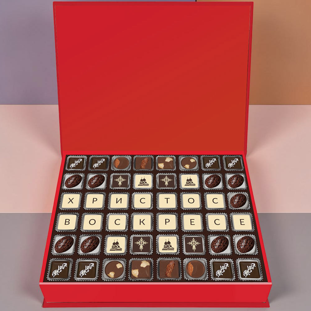 Состав: шоколадные массы - сахар, какао масло, сыворотка молочная сухая, сухое обезжиренное молоко, сухое цельное молоко, тертое какао, какао-порошок, пахта сухая, эмульгатор (лецитин соевый), соль, натуральная ваниль; начинки - сахар, патока крахмальная карамельная, какао-масло, какао тертое, молоко сгущенное (молоко цельное, сахар (сахароза, лактоза)), масла растительные рафинированные дезодорированные (подсолнечное, рапсовое, оливковое; масло сладко-сливочное, молоко сухое обезжиренное), цукаты клубники, цукаты апельсиновых корочек, цукаты папайи, цукаты ананаса, финики, слива, абрикос, ядра орехов фундука, ядра орехов миндаля, марципановая масса, стабилизатор (мальтодекстрин), коньяк (дистиллят коньячный, вода, сахар, пищевой краситель (сахарный колер), спирт этиловый ректификованный, консервант (сорбиновая кислота), регулятор кислотности (лимонная кислота), эмульгаторы (лецитин соевый, Е471), ароматизаторы, пищевой краситель (сахарный колер); декор - пищевые красители (Е132, Е171, куркумин, красный свекольный, медные комплексы хлорофиллов и хлорофиллинов). Внимание! В продукте возможно наличие фрагментов фруктовых косточек абрикоса натурального, фиников натуральных, сливы натуральной. Продукция производится на предприятии, где используются арахис, кунжут, орехи, яичные и молочные продукты, злаки, содержащие глютен.