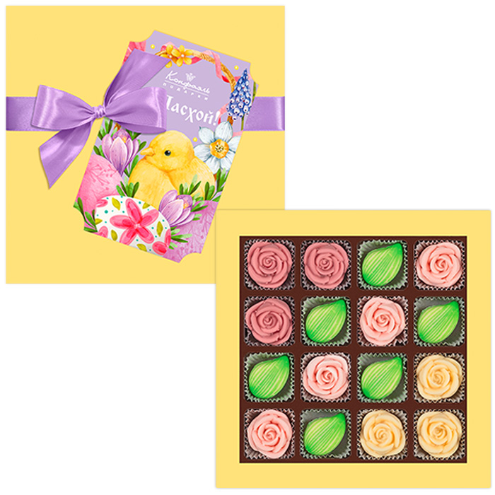 Состав: сахар, масло какао, сухое обезжиренное молоко, сухое цельное молоко, пахта сухая, сухой сок свеклы, сухой сок вишни, сухой сок клубники, эмульгатор (лецитин соевый), соль, натуральная ваниль; декор – пищевой краситель (медные комплексы хлорофиллов и хлорофиллинов). Продукция производится на предприятии, где используются арахис, кунжут, орехи, яичные и молочные продукты, злаки, содержащие глютен.