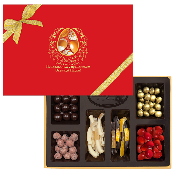 Состав: шоколадные массы - сахар, тертое какао, сахар, какао-порошок, масло какао, сухое обезжиренное молоко, сухое цельное молоко, пахта сухая, эмульгатор (лецитин соевый), соль, натуральная ваниль; начинки - сахар, патока, цукаты апельсиновых корочек, цукаты лимонных корочек, ананас сушеный, клюква, черешня засахаренная, какао-порошок, спирт этиловый ректификованный; декор - пищевые красители свекольный концентрат, кандурин золотой. Продукция производится на предприятии, где используются арахис, кунжут, орехи, яичные и молочные продукты, злаки, содержащие глютен.