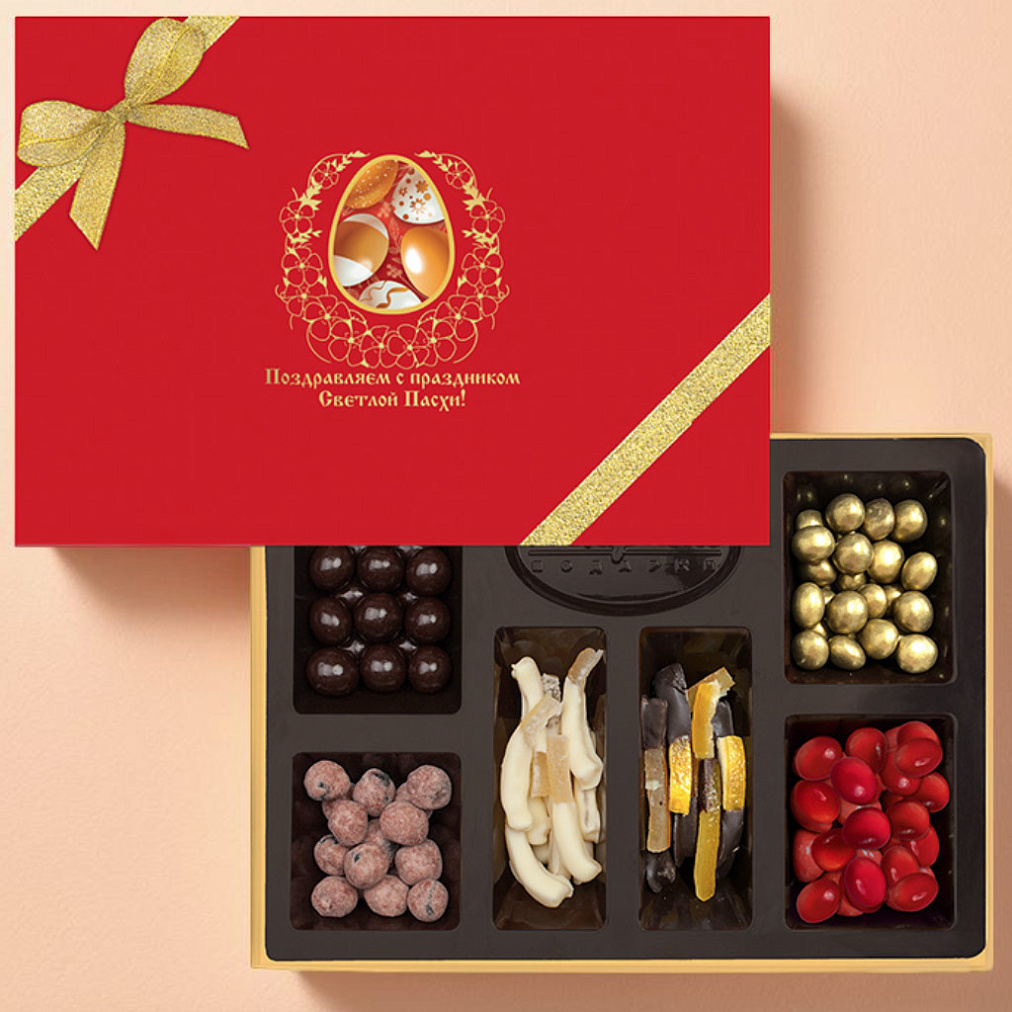 Драже «Черешня» в горьком шоколаде, Черешня засахаренная, Цукаты из апельсиновых корочек в белом и горьком шоколаде, Цукаты из лимонных корочек в белом и горьком шоколаде, драже «Ананас» в горьком шоколаде с декором, драже «Клюква» в шоколаде