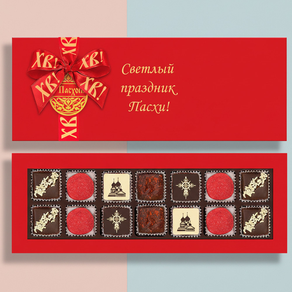 Состав: шоколадные массы – сахар, тертое какао, какао-порошок, масло какао, сухое обезжиренное молоко, сухое цельное молоко, пахта сухая, эмульгатор (лецитин соевый), соль, натуральная ваниль; начинки – сахар, патока, какао-масло, какао тертое, молоко сгущенное (молоко цельное, сахар (сахароза, лактоза)), масла растительные рафинированные дезодорированные (подсолнечное, рапсовое, оливковое; масло сладко-сливочное, молоко сухое обезжиренное), натуральный концентрированный сок малины, пюре малины, пюре манго, пюре маракуйи, малина сублимированная, ядра орехов миндаля, ядра орехов фисташки, марципановая масса, соль, какао-порошок, стабилизатор (мальтодекстрин), коньяк (дистиллят коньячный, вода, сахар, пищевой краситель (сахарный колер)), консервант (сорбиновая кислота), регулятор кислотности (лимонная кислота), эмульгаторы (лецитин соевый, Е471), ароматизаторы, пищевой краситель (сахарный колер); декор – пищевые красители (Е172, Е171, кандурин красный янтарь). Продукция производится на предприятии, где используются арахис, кунжут, орехи, яичные и молочные продукты, злаки, содержащие глютен