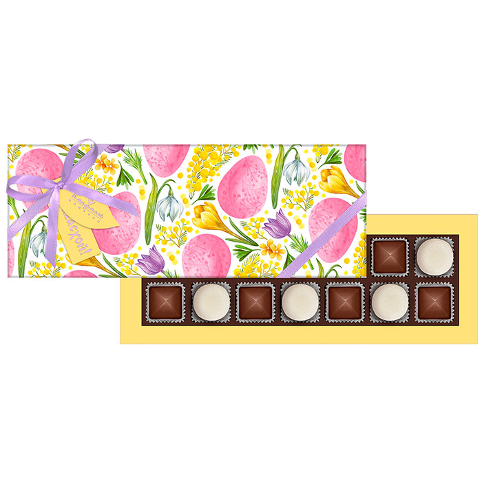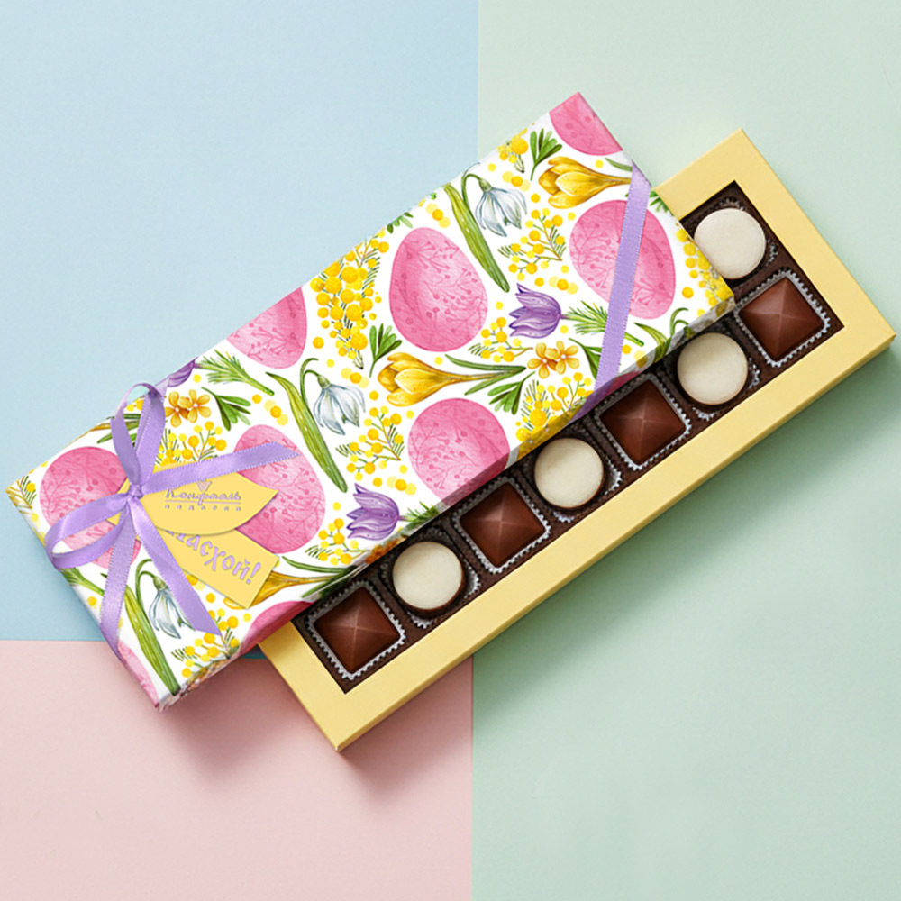 Состав: шоколадные массы – сахар, тертое какао, какао-порошок, масло какао, сыворотка молочная сухая, сухое цельное молоко, молочный жир, паста ореховая из ядер фундука, эмульгаторы (лецитин соевый, Е476), соль, ароматизатор; начинки – сахар, патока крахмальная карамельная, масло какао, тертое какао, молоко сгущенное (молоко цельное, сахар (сахароза, лактоза)), стабилизатор (мальтодекстрин), желирующий агент (агар), желатин говяжий, коньяк (дистиллят коньячный, вода, сахар, пищевой краситель «Сахарный колер»), спирт этиловый ректификованный, консервант (сорбиновая кислота), регулятор кислотности (лимонная кислота), эмульгаторы (лецитин соевый, Е471), ароматизаторы, пищевые красители (Е171). Внимание! Продукция производится на предприятии, где используются арахис, кунжут, орехи, яичные и молочные продукты, злаки, содержащие глютен.