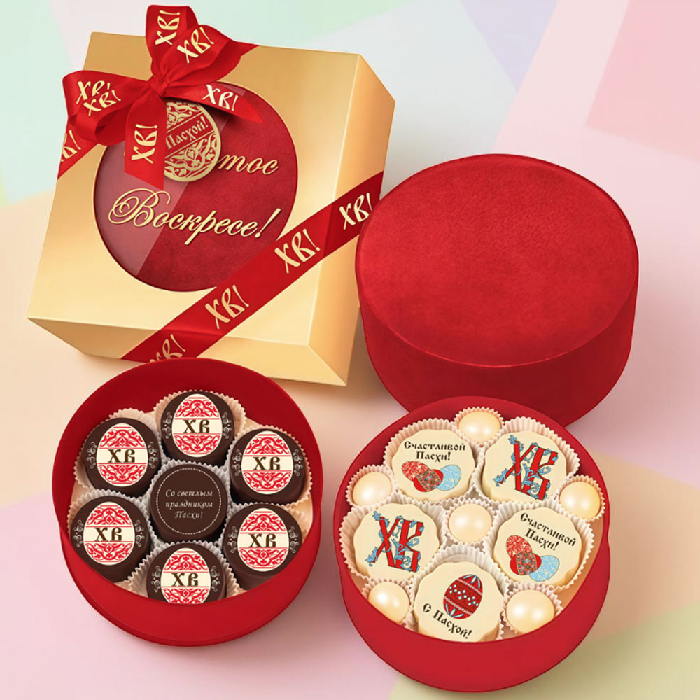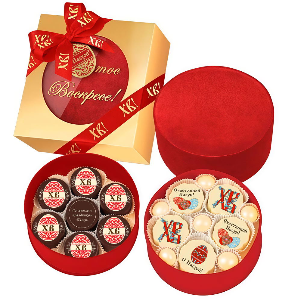 Конфеты «Суфле» в горьком шоколаде с декором (шоколадное), шоколадные конфеты «Ассорти» со сливочной начинкой и декором, драже «Фундук» в белом шоколаде
