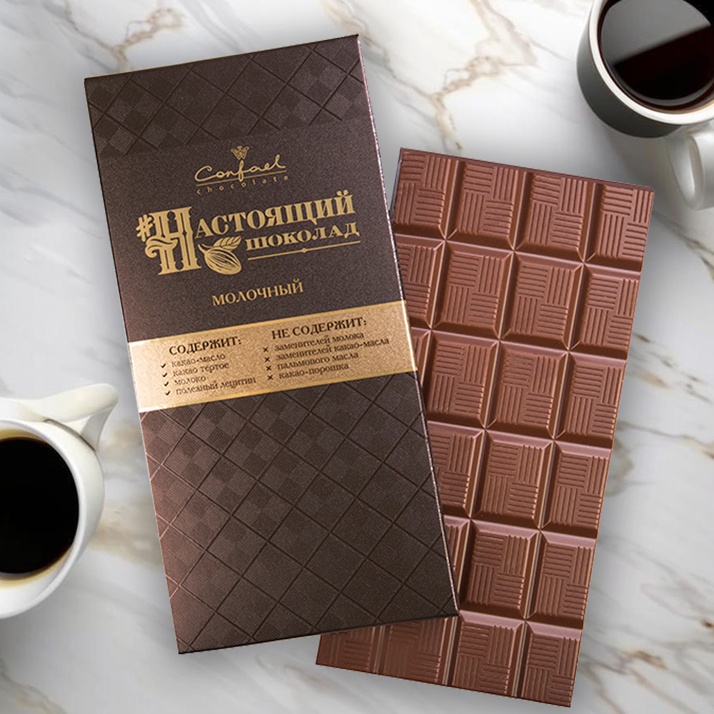 Натуральный шоколад не содержит заменителей какао-масла, пальмового, масла ши и других вредных жиров, а также какао-порошка, что отличает "Конфаэль" от большинства современных производителей.