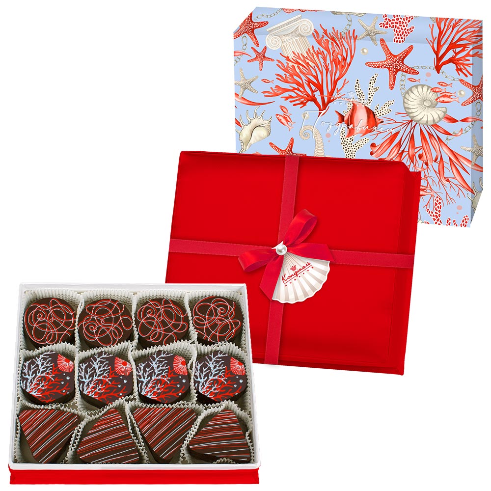Состав: шоколадная масса – сахар, какао тёртое, масло какао, эмульгатор (лецитин соевый), ароматизатор; начинки – сахар, патока, молоко сгущенное (молоко цельное, сахар (сахароза, лактоза)), масло сладко-сливочное, какао-порошок, желирующий агент (агар), яичный белок, регулятор кислотности (лимонная кислота), консервант (сорбиновая кислота), эмульгаторы (Е471), ароматизаторы, натуральный пищевой краситель («сахарный колер»); натуральный экстракт ванили, натуральный экстракт кофе; декор – пищевые красители (Е171, красный свекольный). Продукция производится на предприятии, где используются арахис, кунжут, орехи, яичные и молочные продукты, злаки, содержащие глютен.