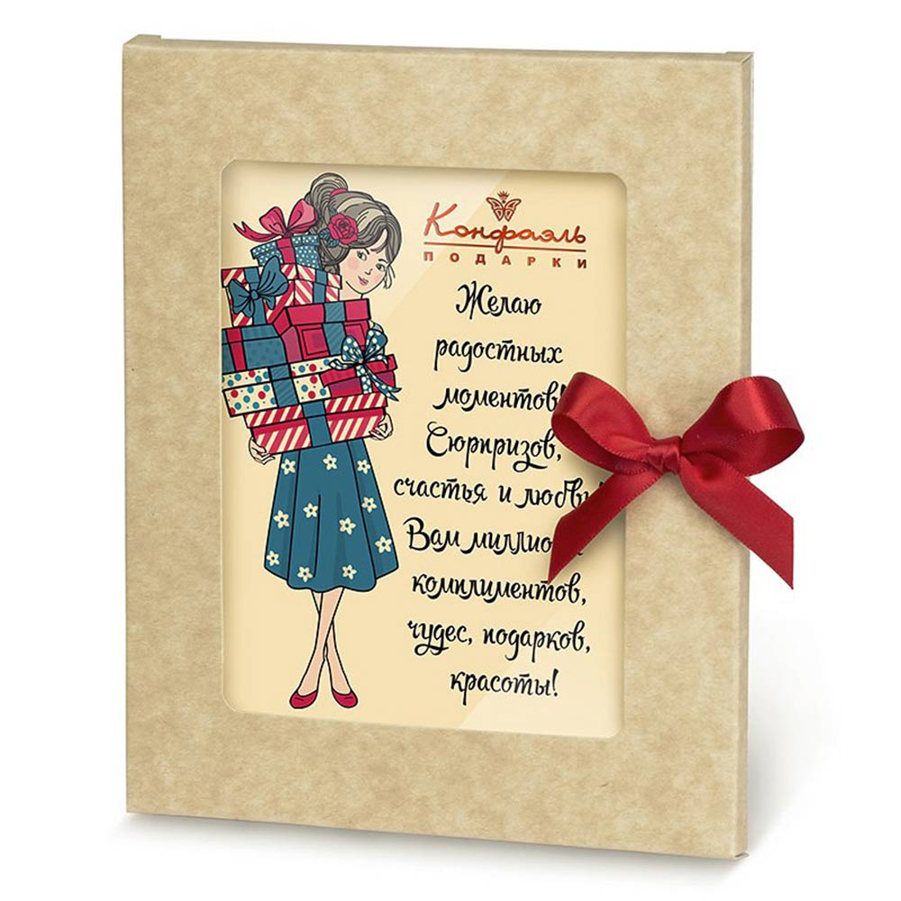 Магазин «Конфаэль» предлагает вам эксклюзивный подарок для ваших близких и друзей - оригинальную открытку-десерт из белого шоколада, изготовленную без массового тиражирования.