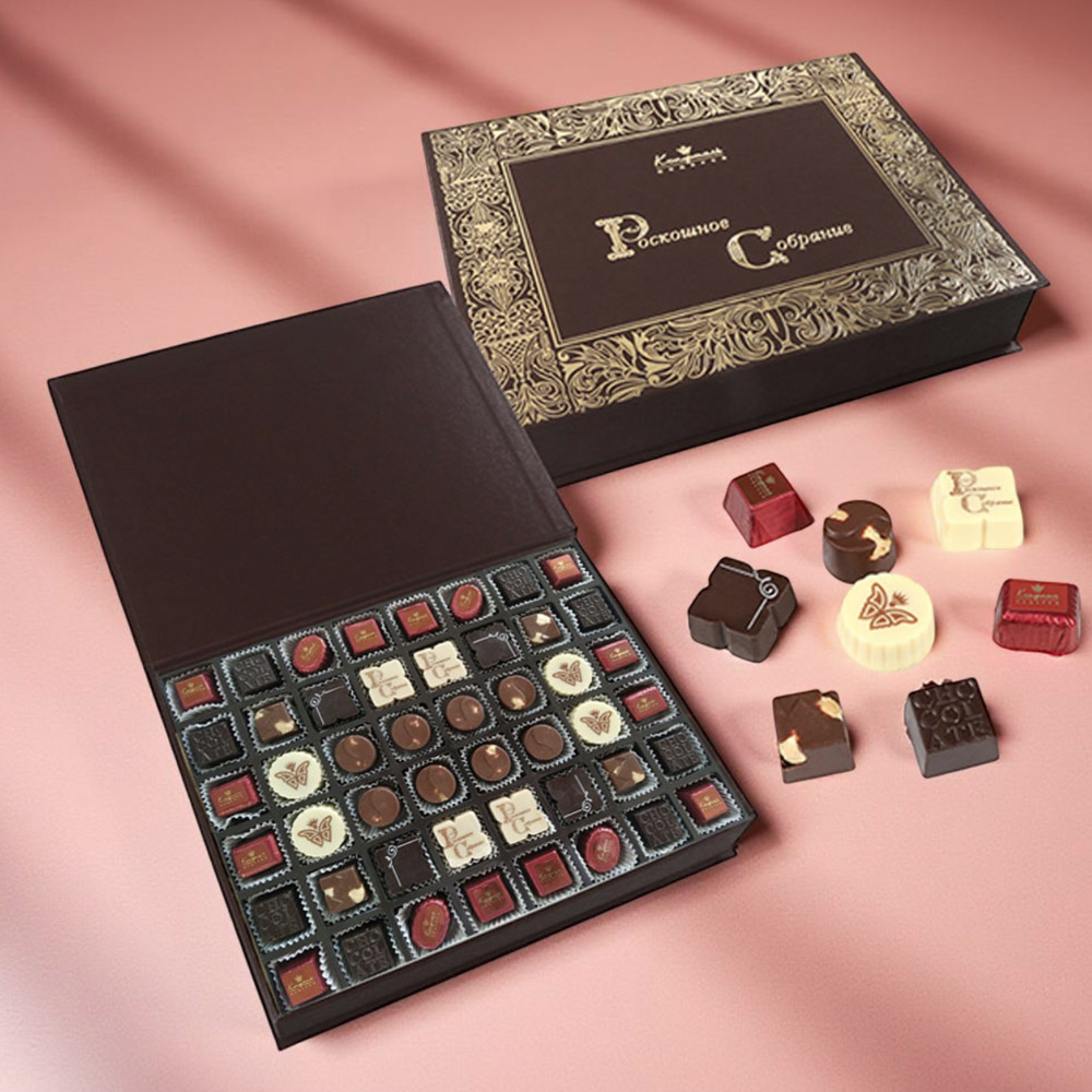 шоколадные массы – какао-масло, какао тертое, сахар, молоко сухое цельное, молоко сухое обезжиренное, лактоза, эмульгатор (лецитин соевый), ароматизатор («Ванилин»); начинки – сахар, патока, какао-масло, какао тертое, молоко сгущенное (молоко цельное, сахар (лактоза, сахароза)), молоко сухое, масло сладко-сливочное, рафинированные, дезодорированные, растительные масла, натуральные концентрированные соки, финики, чернослив, абрикос сушеный, ядра орехов фундука, ядра орехов миндаля, стабилизатор (мальтодекстрин), яичный белок, какао-порошок, желирующие агенты (агар, желатин), коньяк (дистиллят коньячный, вода, сахар, натуральный пищевой краситель «карамельный колер»), спирт этиловый ректификованный, яичный ликер, консервант (сорбиновая кислота), регулятор кислотности (лимонная кислота), эмульгаторы (лецитин соевый, Е471), натуральный экстракт ванили, натуральный экстракт кофе, ароматизаторы («Апельсин», «Вишня», «Земляника», «Яблоко», «Виноград», «Молочная карамель», «Кофе», «Бейлиз», «Клубника»), натуральный пищевой краситель «Карамельный колер»; декор – пищевые красители (Е100, Е120, Е132, Е171), глазирователь (капол)