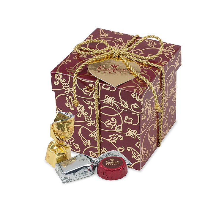шоколадные массы – какао тертое, сахар, какао-масло, молоко сухое цельное, эмульгатор (лецитин соевый), ароматизатор («Ванилин»); начинки – сахар, патока, молоко сгущенное (молоко цельное, сахар, (сахароза, лактоза), сливки сгущенные с сахаром (сливки нормализованные, сахар (сахароза), лактоза), молоко сухое цельное, молоко сухое обезжиренное, какао-масло, какао тертое, рафинированные, дезодорированные, растительные масла, стабилизатор (мальтодекстрин), абрикосы сушеные, чернослив, ядра орехов миндаля, ядра орехов фундука, ананас сушеный, папайя сушеная, яичный белок, лактоза, желирующий агент (агар), коньяк (дистиллят коньячный, вода, сахар, натуральный пищевой краситель «карамельный колер»), спирт этиловый ректификованный, регулятор кислотности (лимонная кислота), консервант (сорбиновая кислота), эмульгаторы (лецитин соевый, Е471 ), ароматизаторы («Бейлиз», «Карамель», «Бренди», «Апельсин»), натуральный пищевой краситель «Карамельный колер»
