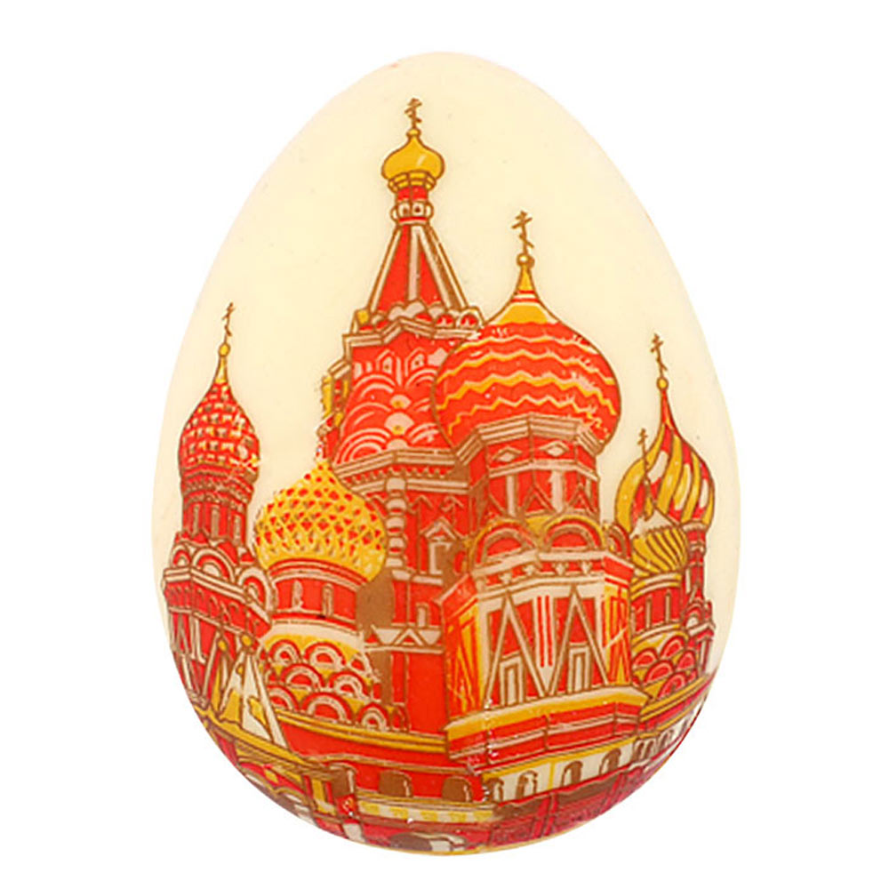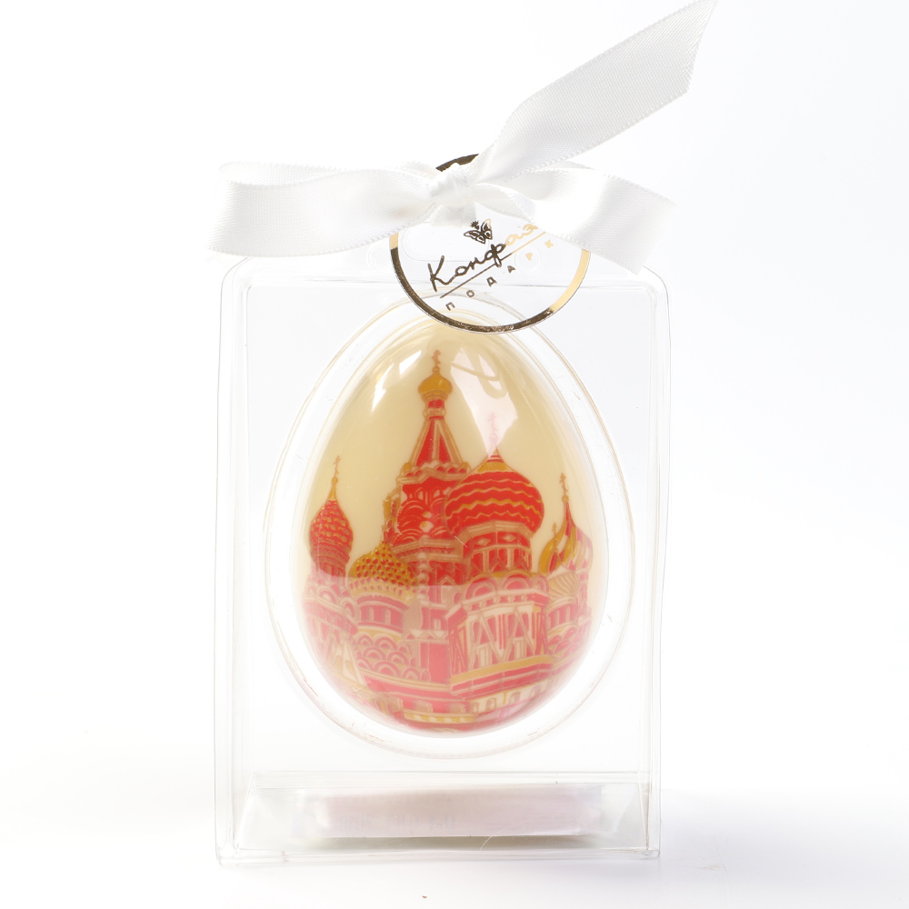 Изящная упаковка с вкусным шоколадом в виде яйца с изображением собора Василия Блаженного - дивный сувенир для вашего близкого человека или просто хорошего друга.