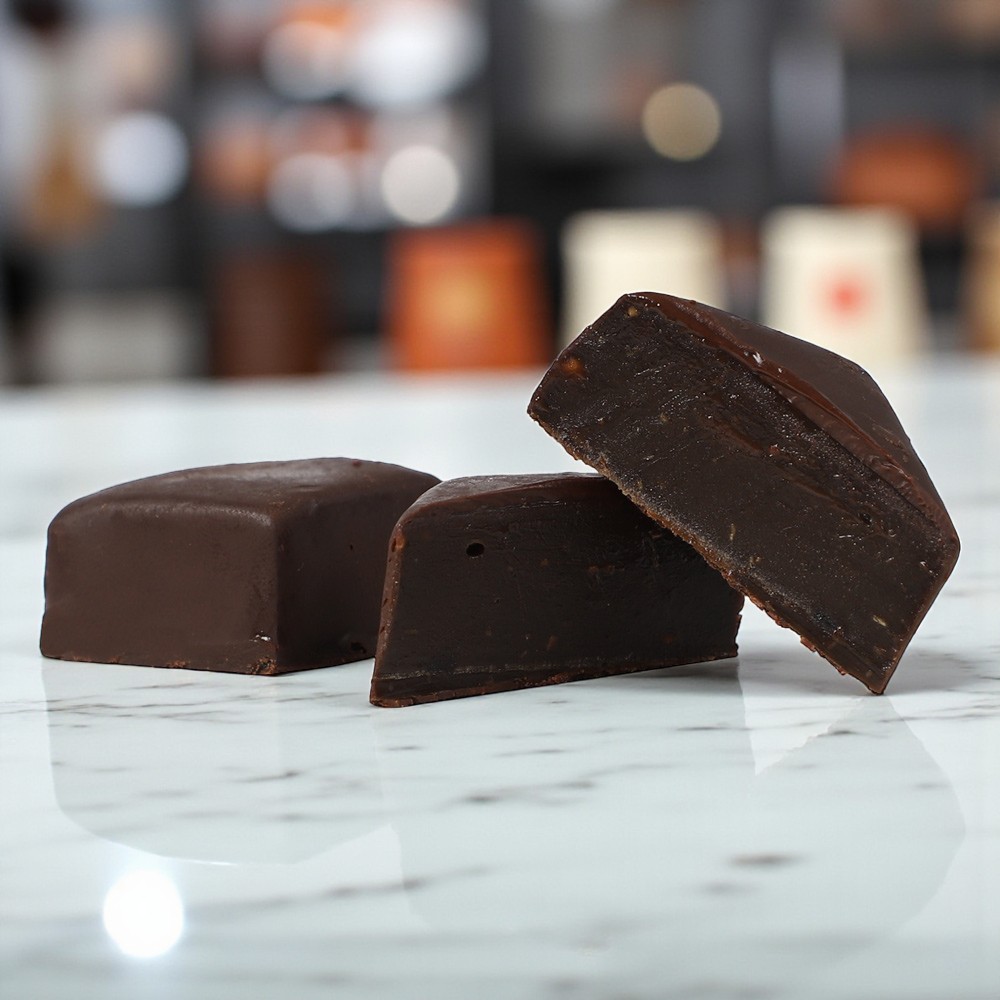 Состав: шоколадная масса – сахар, тертое какао, масло какао, какао-порошок, эмульгатор (лецитин соевый), натуральная ваниль; начинка – сахар, патока, какао-масло, какао тертое, молоко сгущенное (молоко цельное, сахар (сахароза, лактоза)), молоко сухое обезжиренное, масла растительные рафинированные дезодорированные (подсолнечное, рапсовое, оливковое; масло сливочное (из пастеризованных коровьих сливок), молоко сухое обезжиренное), белок яичный, кумкват, клубника сушеная, цукат имбиря, цукаты лимонных корочек, папайя сушеная, ананас сушеный, финики, чернослив, абрикос сушеный, стабилизатор (мальтодекстрин), желирующие агенты (агар), пищевой краситель «Сахарный колер»), консервант (сорбиновая кислота), регулятор кислотности (лимонная кислота), эмульгаторы (лецитин соевый, Е471), ароматизаторы.