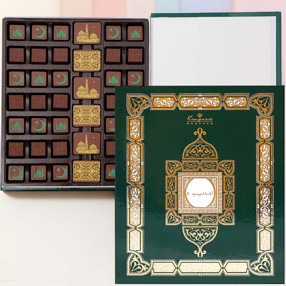 Специально для мусульман: набор молочного декорированного шоколада и конфет из него, украшенных рисунками с исламской символикой.