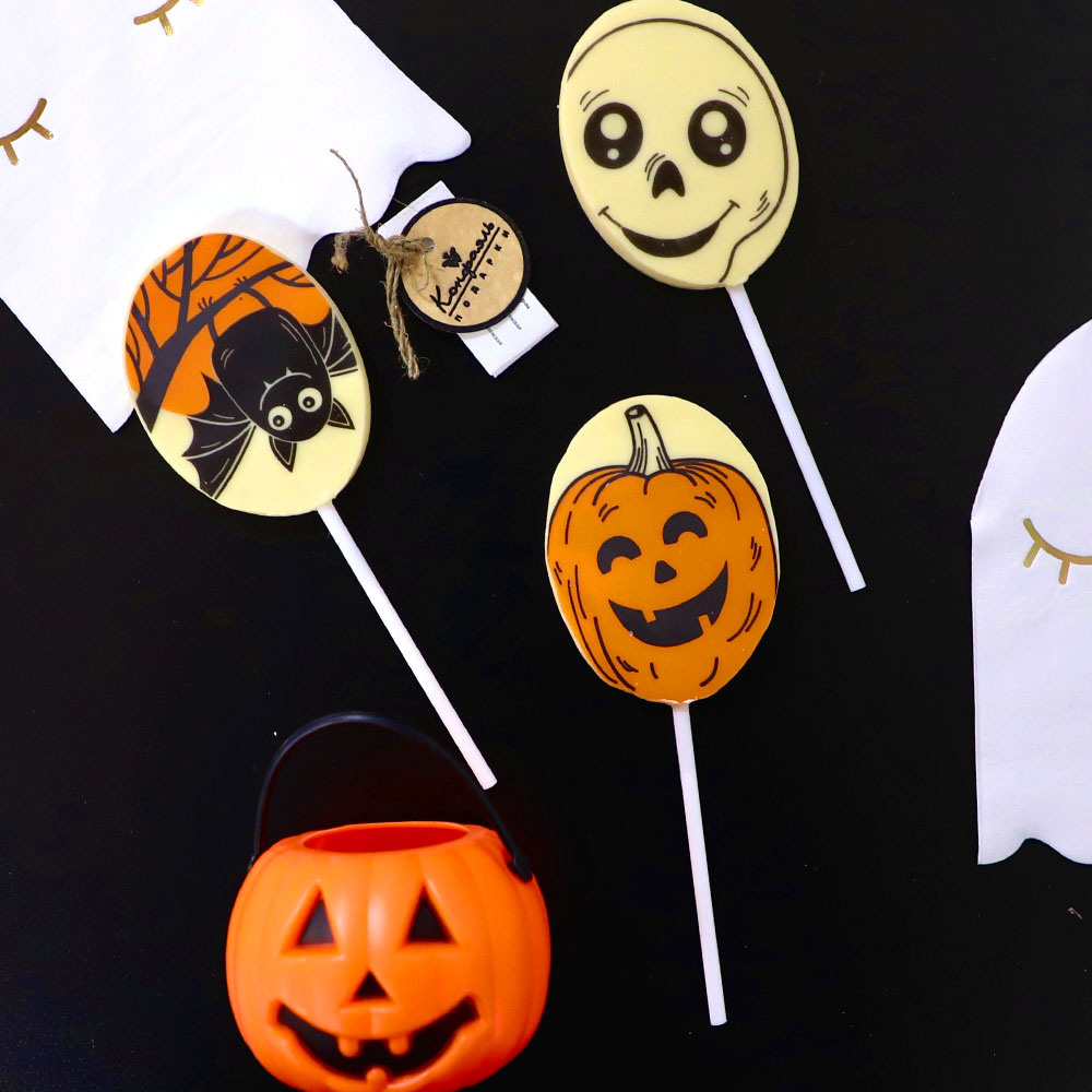 Угощение или жизнь? Так обычно выпрашивают сладости на Хэллоуин Конечно же угощение! Этот очаровательный леденец из белого шоколада обязательно понравится Вашему ребенку! Скоротайте осенний вечер за поеданием сладостей от Конфаэль!
