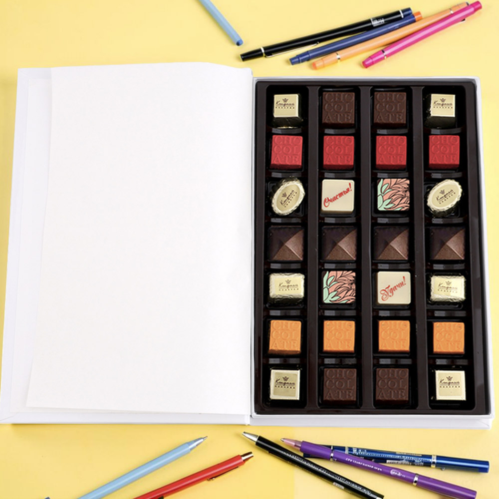 шоколадные массы - какао-масло, какао тертое, сахар, молоко сухое цельное, молоко сухое обезжиренное, лактоза, эмульгатор (лецитин соевый), ароматизатор («Ванилин»); начинки - сахар, патока, какао-масло, какао тертое, молоко сгущенное (молоко цельное, сахар (сахароза, лактоза)), сливки сгущенные с сахаром (сливки нормализованные, сахар (сахароза), лактоза), молоко сухое, рафинированные дезодорированные растительные масла, натуральные концентрированные соки, стабилизатор (мальтодекстрин, гуммиарабик), желирующие агенты (агар, желатин говяжий), коньяк (дистиллят коньячный, вода, сахар, натуральный пищевой краситель «карамельный колер»), спирт этиловый ректификованный, консервант (сорбиновая кислота), регулятор кислотности (лимонная кислота), эмульгаторы (лецитин соевый, Е471), ароматизаторы («Вишня», «Апельсин», «Ваниль», «Черная смородина»,«Клубника», «Карамель», «Кофе», «Кокосовые сливки», «Бейлиз»), натуральный пищевой краситель «Карамельный колер»; декор - пищевые красители (куркумин, Е132, Е171), пищевой краситель (концентрированный сок красной свёклы, масло подсолнечное, эмульгаторы (мальтодекстрин, Е472с), регуляторы кислотности (лимонная кислота, аскорбиновая кислота))