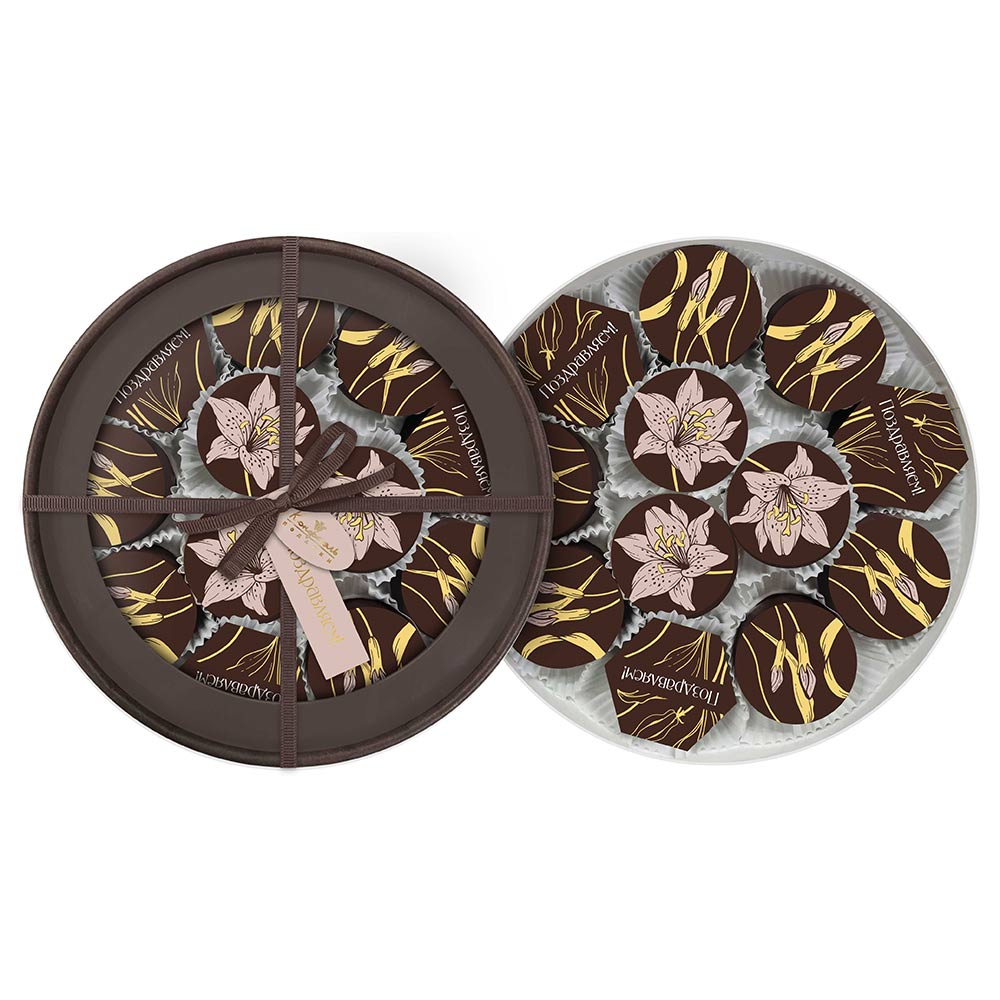 Состав: шоколад – сахар, какао тёртое, масло какао, эмульгатор (лецитин соевый), ароматизатор; начинки – сахар, патока, молоко сгущенное (молоко цельное, сахар (сахароза, лактоза)), масло сладко-сливочное, желирующий агент (агар), яичный белок, какао-порошок, эмульгатор (Е471), ароматизаторы, натуральный экстракт кофе, натуральный пищевой краситель «Сахарный колер»; декор – пищевые красители (красный свекольный, Е171, Е132, медные комплексы хлорофиллов и хлорофиллинов). Продукция производится на предприятии, где используются арахис, кунжут, орехи, яичные и молочные продукты, злаки, содержащие глютен.