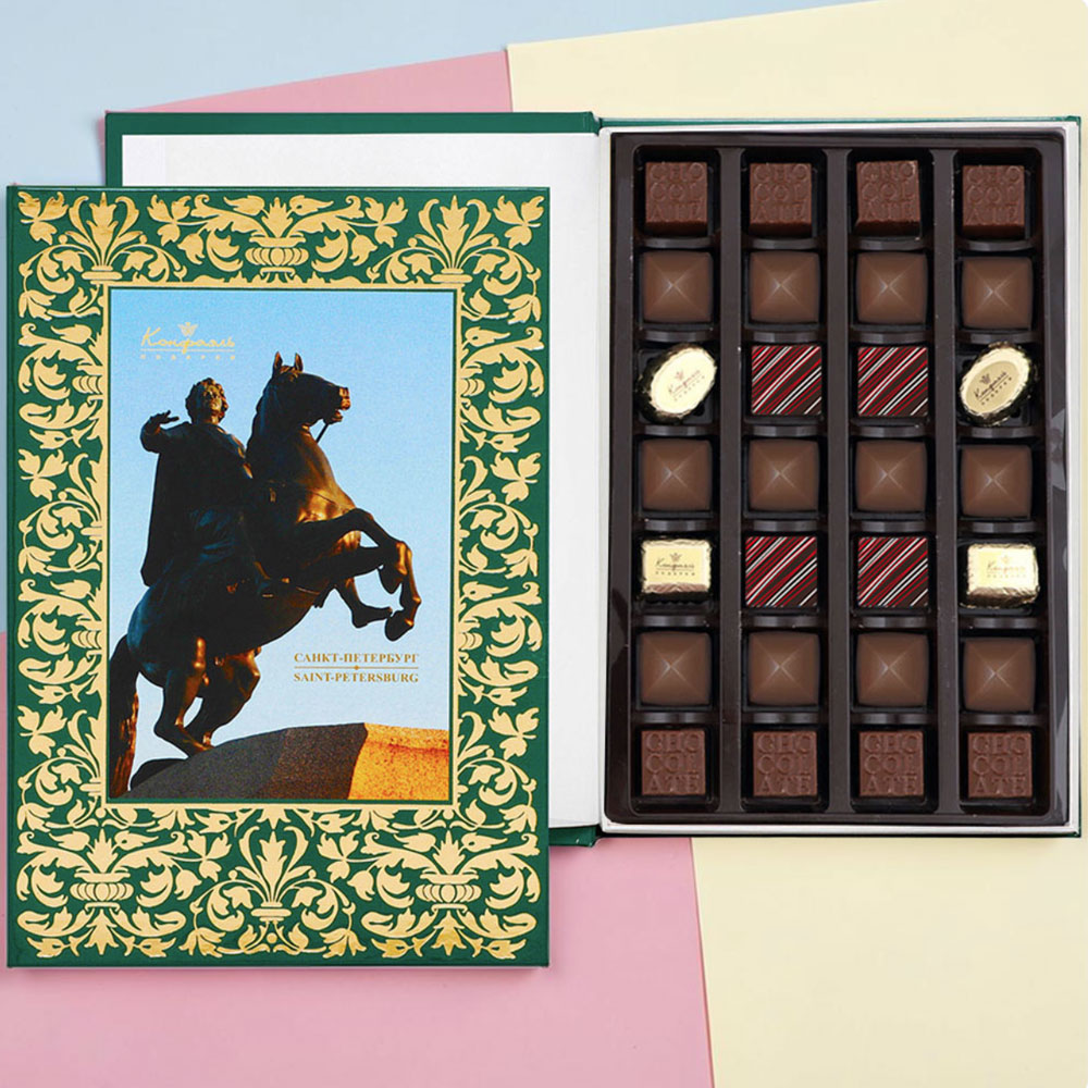 Величественное изображение вставшей на дыбы лошади украшает подарочный набор конфет в виде книги.