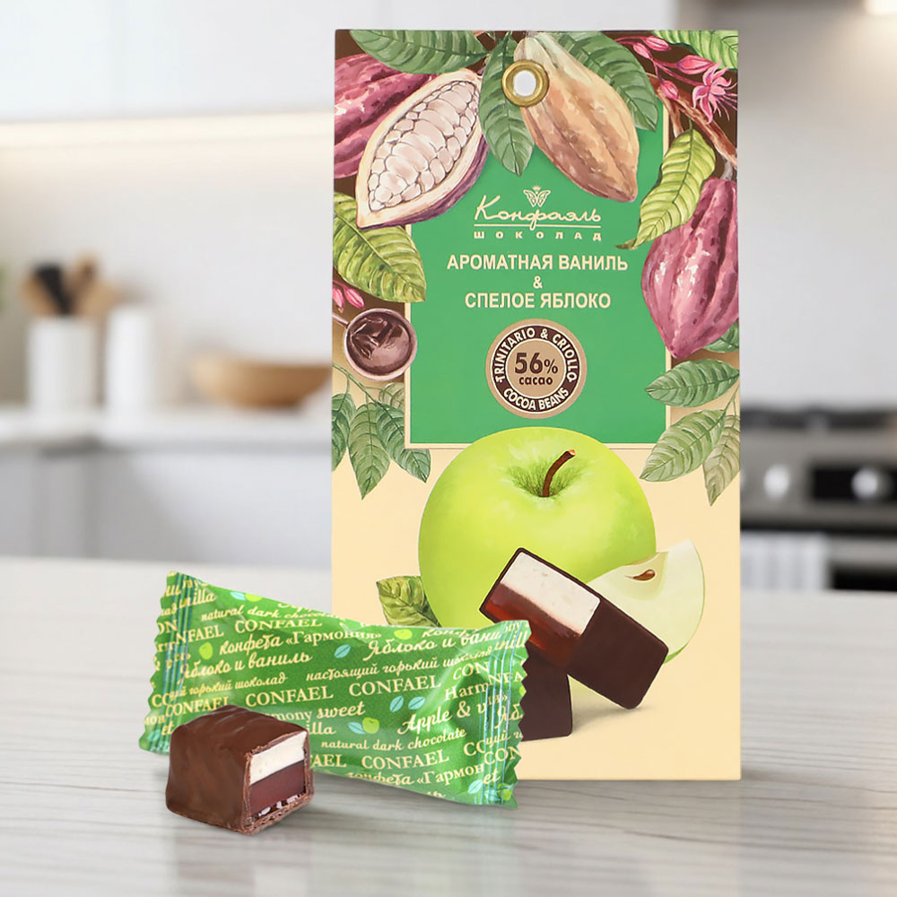 шоколадная масса - какао тертое, сахар, какао-масло, эмульгатор (лецитин соевый), ароматизатор ("Ванилин"), начинки - сахар, патока, молоко сгущенное (молоко цельное, сахар (сахароза, лактоза)), масло сладко-сливочное, натуральный концентрированный яблочный сок, яичный белок сухой, желирующие агенты (агар, желатин говяжий), консервант (сорбиновая кислота), регулятор кислотности (лимонная кислота), эмульгатор (Е471), ароматизаторы, натуральный экстракт ванили.
