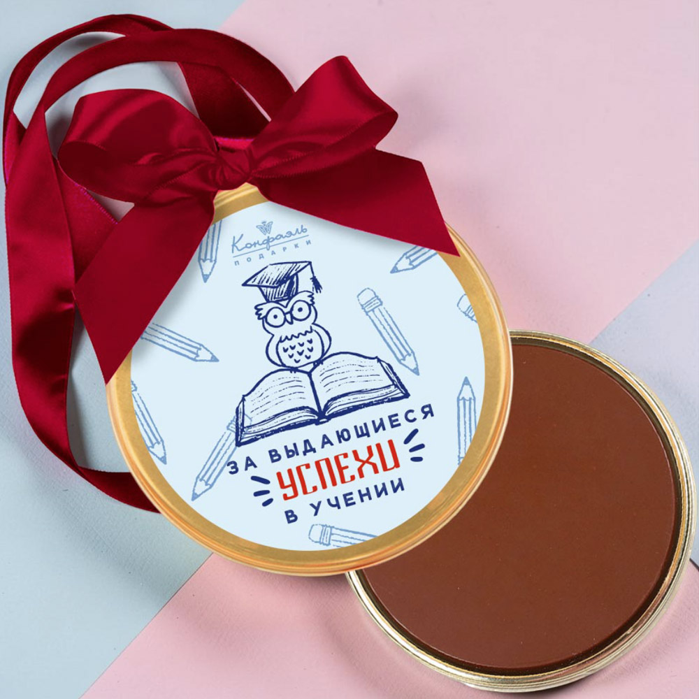Медаль «За выдающиеся успехи в учении» - изготовлена из натурального шоколада без консервантов и упакована в прочную коробочку с дизайнерским оформлением.